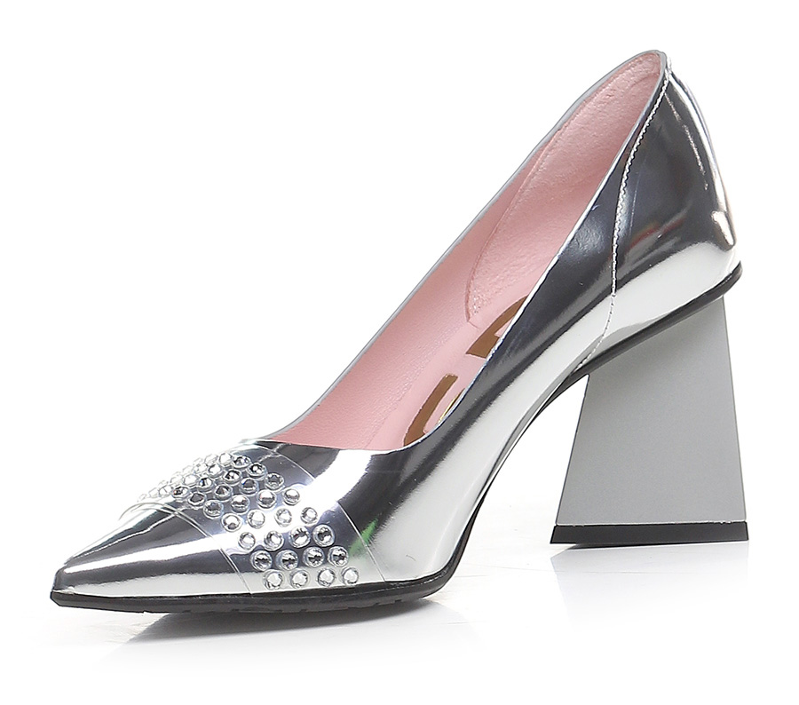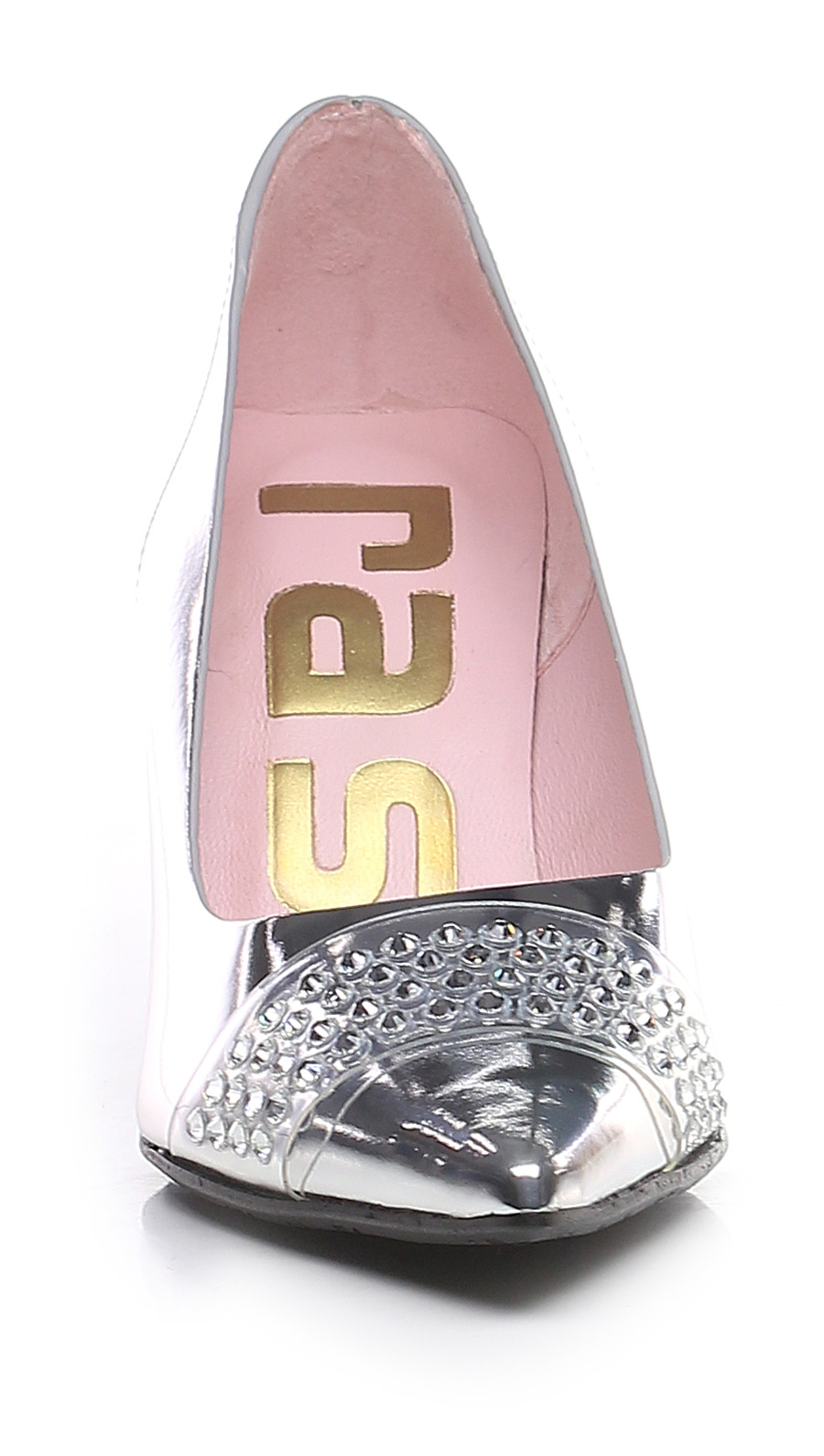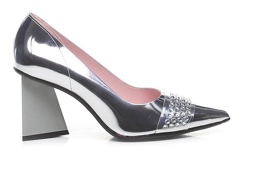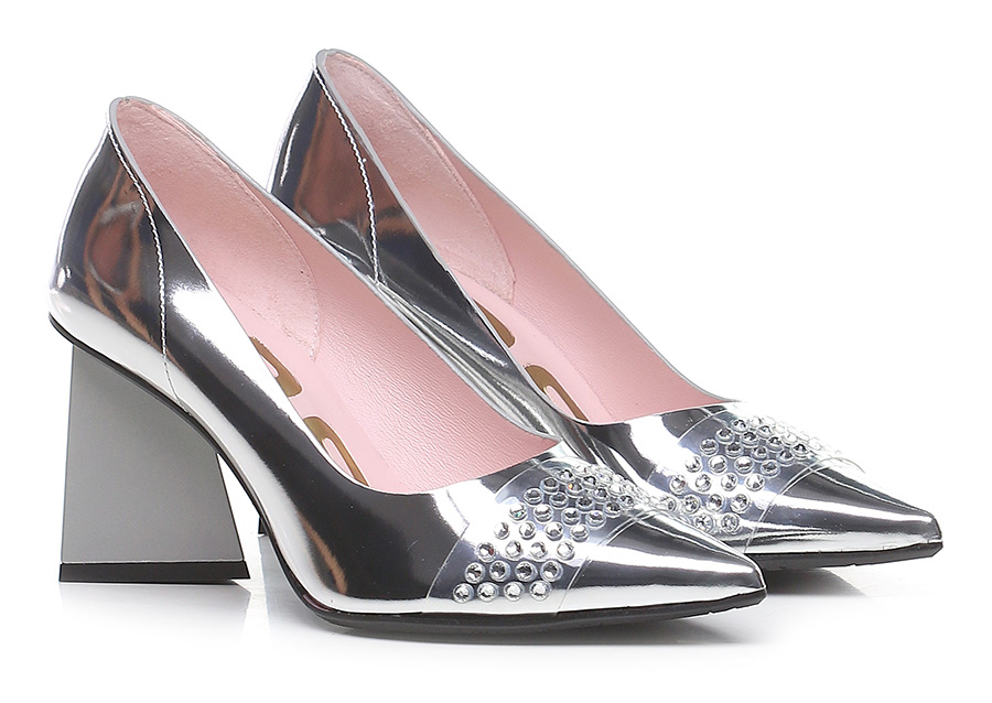 Mirrored leather shoe with front pvc insert with rhinestones. Rubber sole. Heel height 80mm. Matt effect pvc heel.