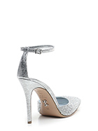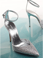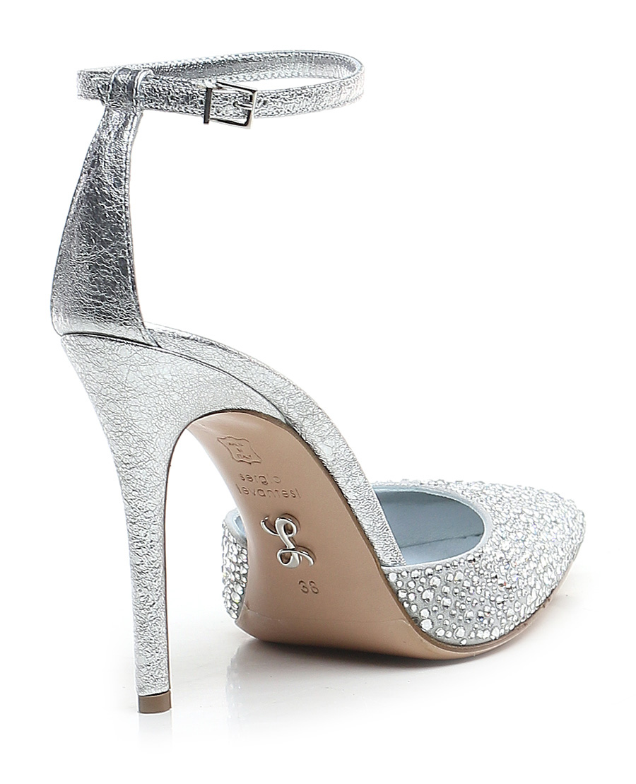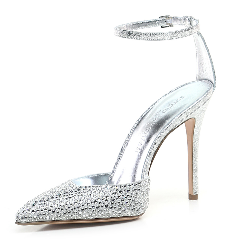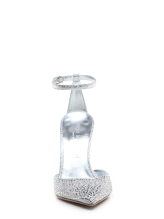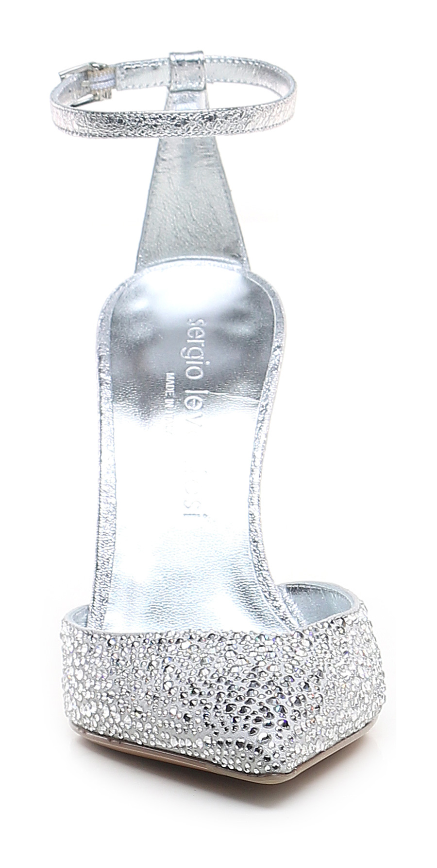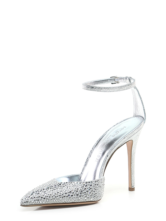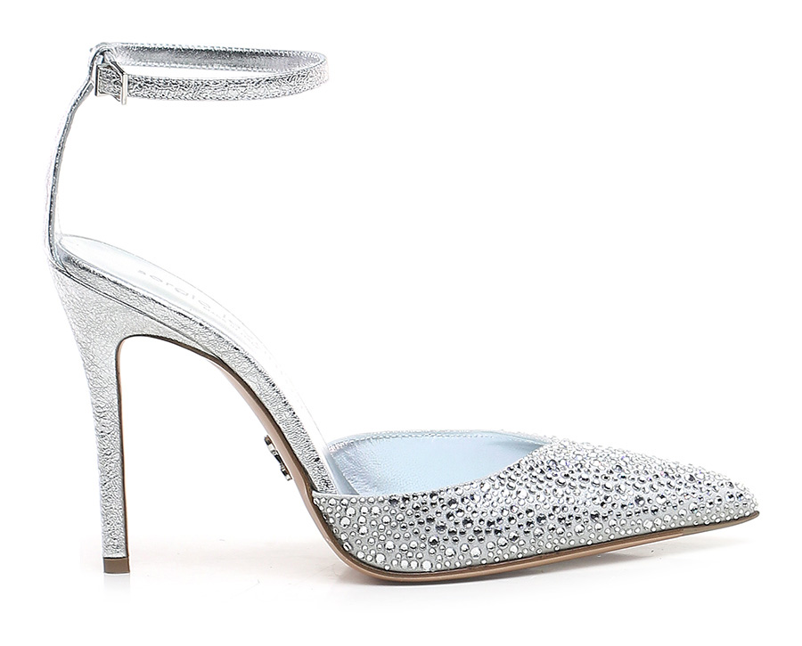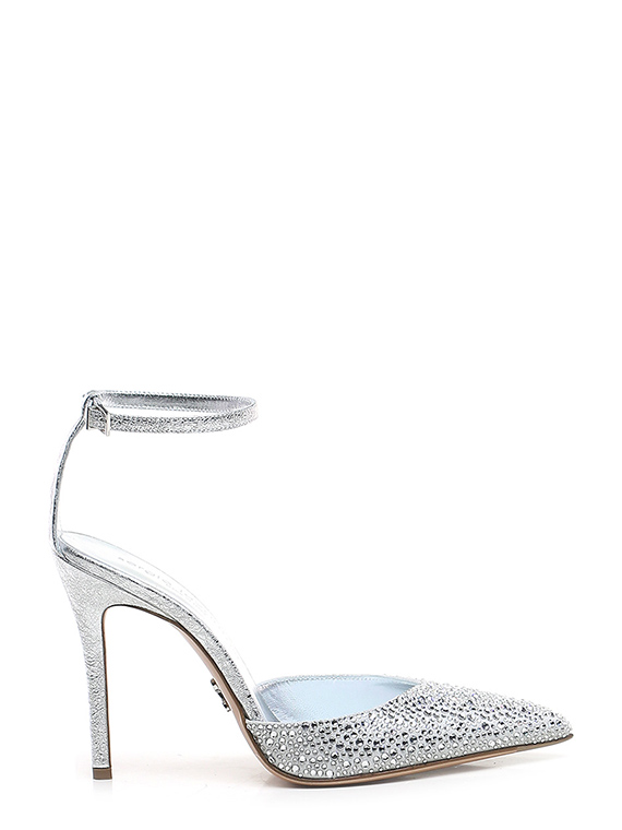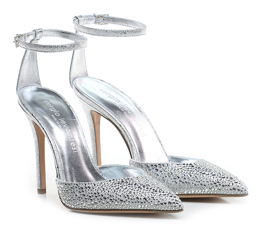 Vintage effect laminated leather shoe with front rhinestones and ankle strap. Leather sole. Heel height 110mm.