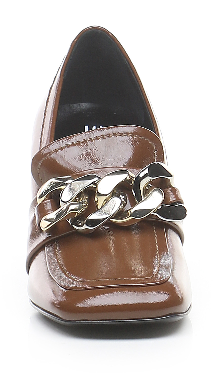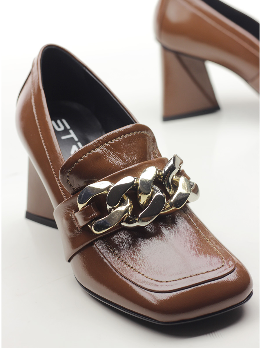Shiny leather shoe with front chain accessory and leather and rubber sole. Heel height 80mm. Heel lined in shiny leather.