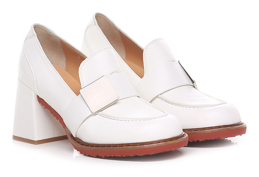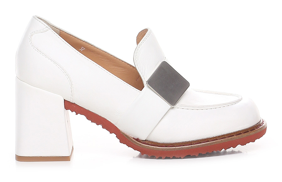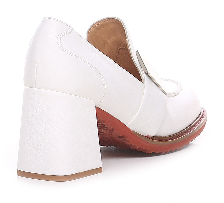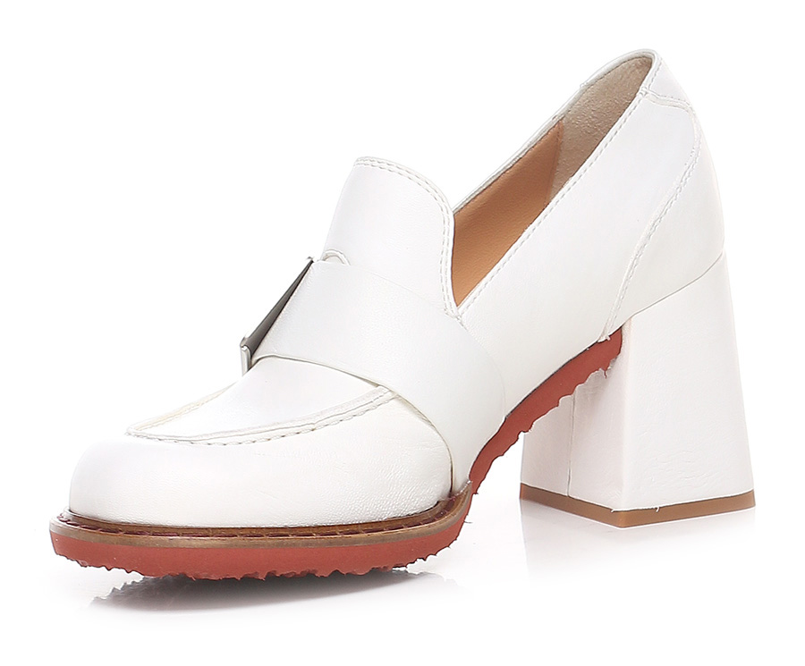 Vintage effect leather shoe with front metal insert. Extralight rubber sole. Heel height 90mm, platform 15mm with 75mm ledge. Leather lined heel.