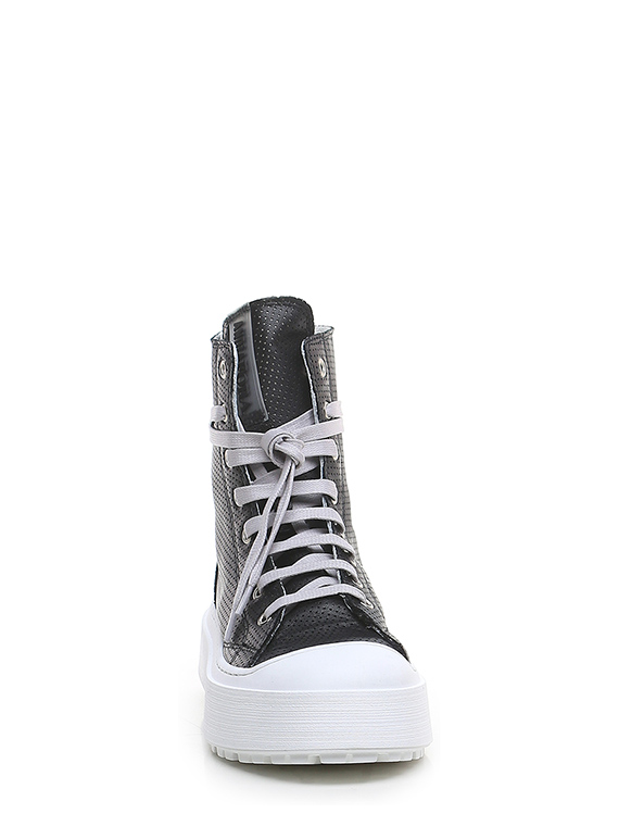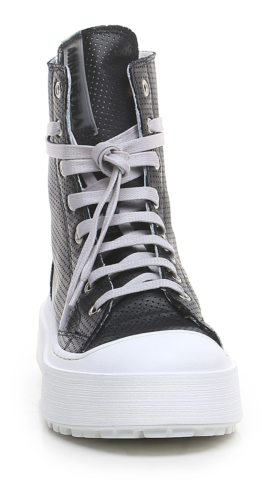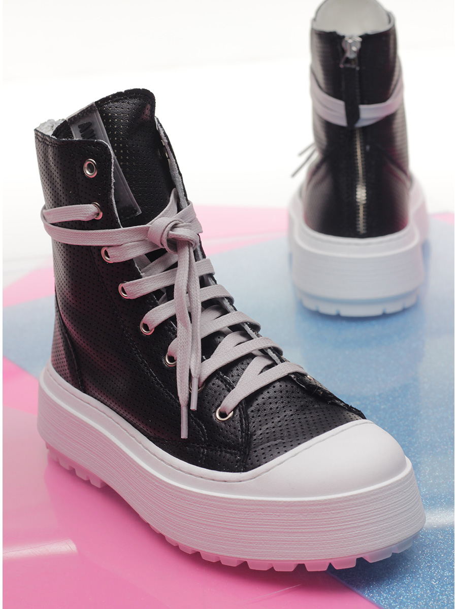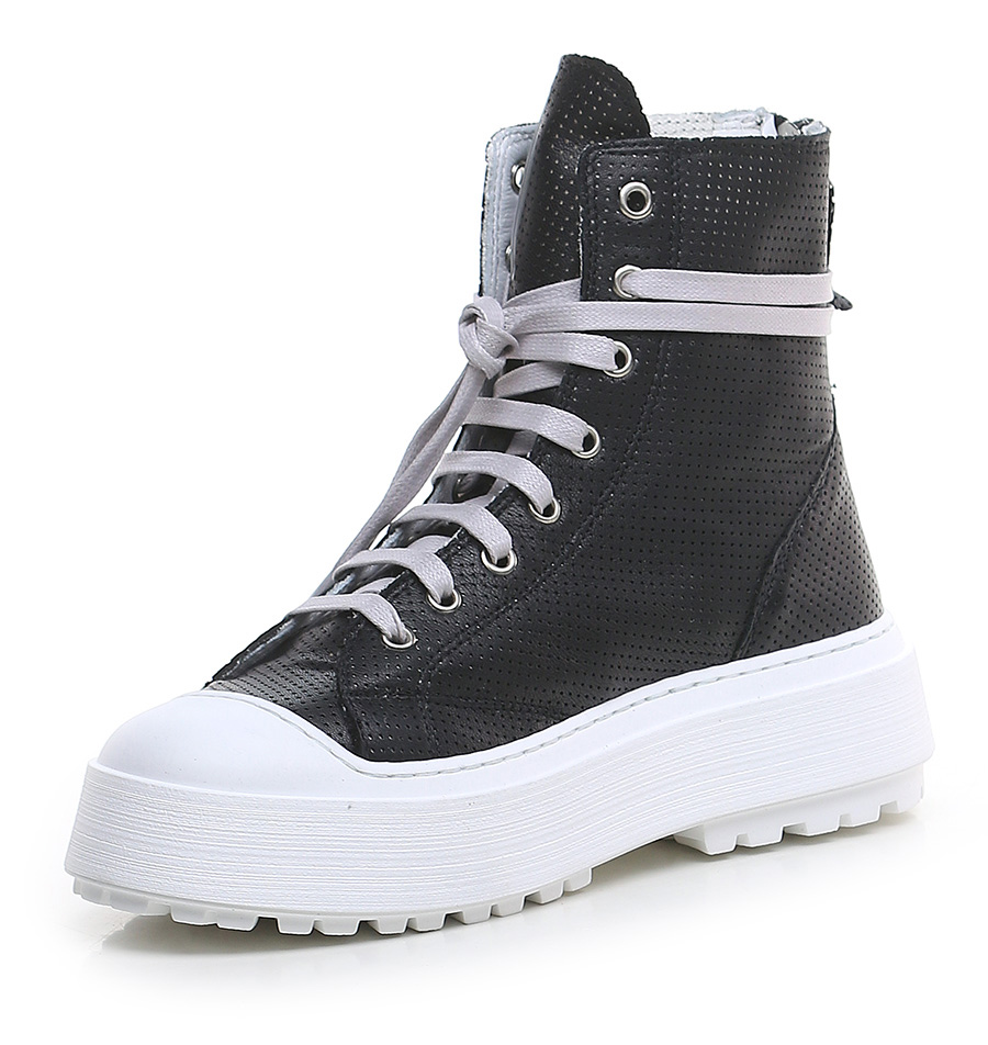 Ankle boot in perforated leather with zip on the back. Rubber sole. 50mm heel height, 40mm platform with 10mm ledge.