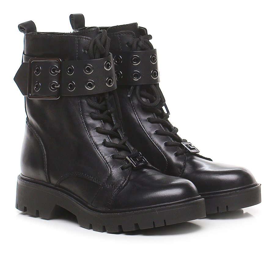 Leather ankle boot with internal zip and strap with buckle on the external side. Rubber lug sole. 35mm heel height, 20mm platform with 15mm ledge.