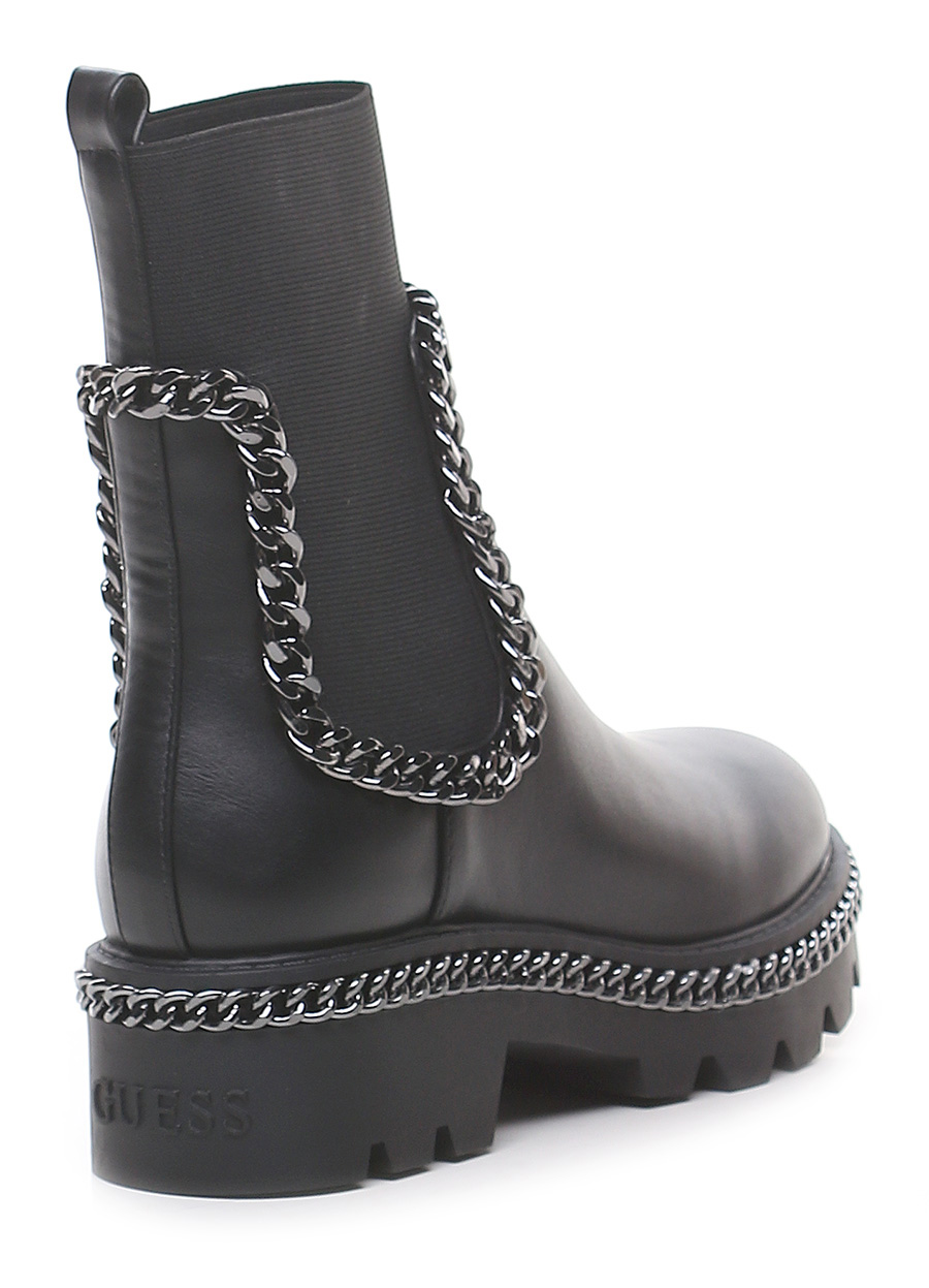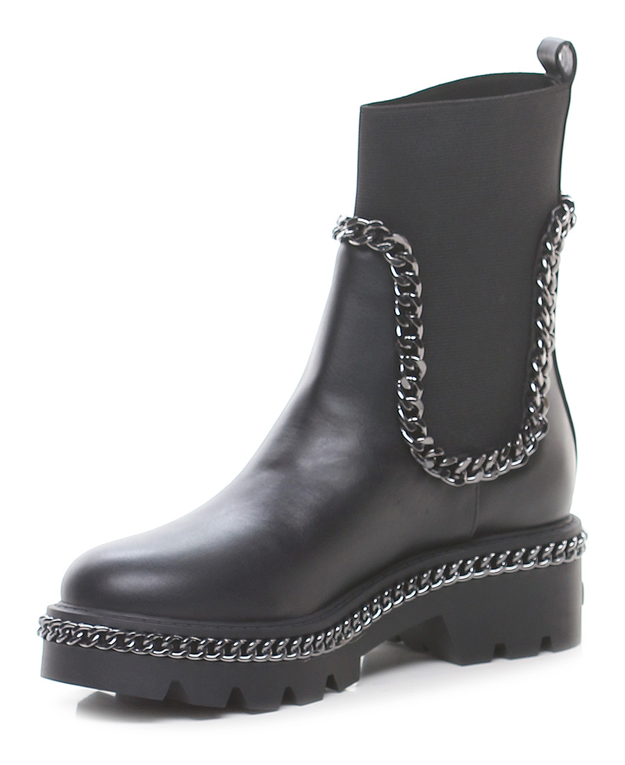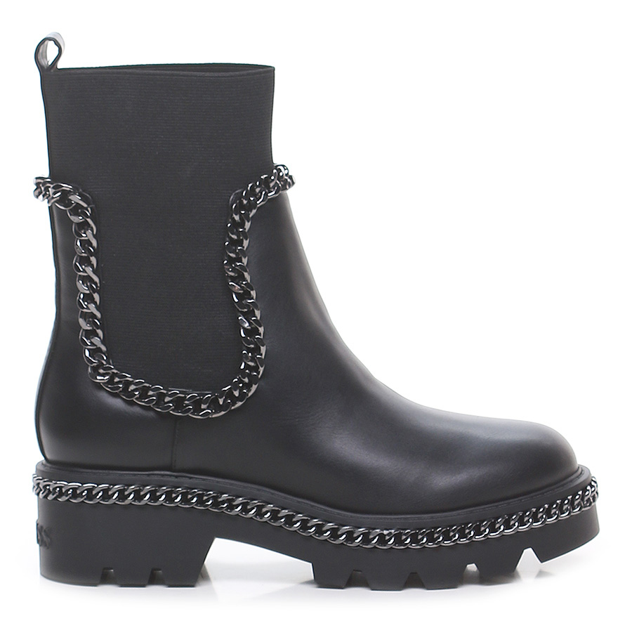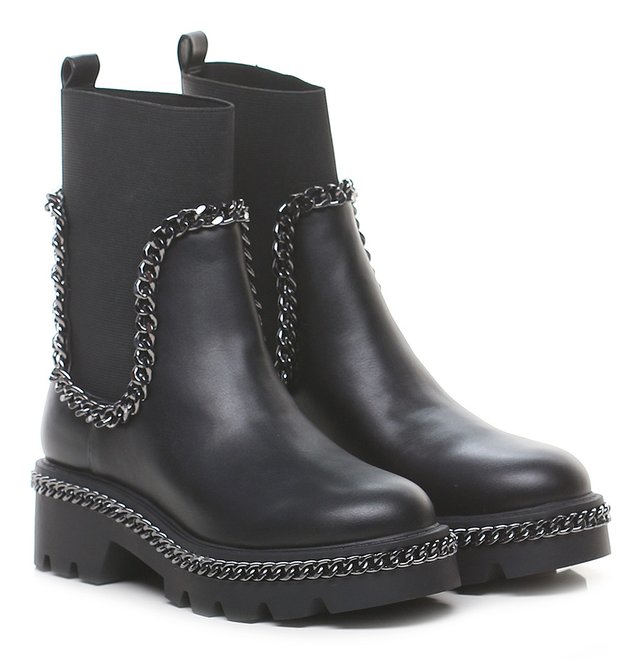 Leather ankle boot with elasticated insert and silver chain accessories on the upper and sole profile. Rubber sole. 50mm heel height, 35mm platform with 15mm ledge.