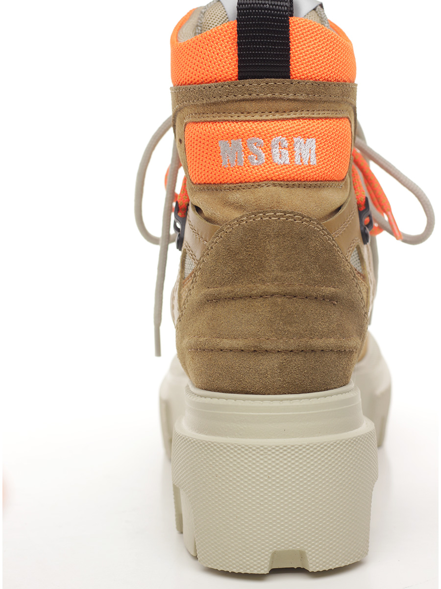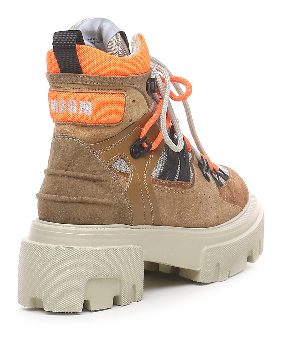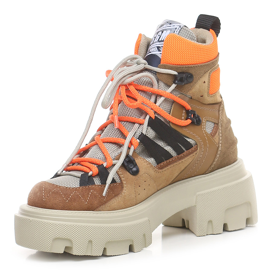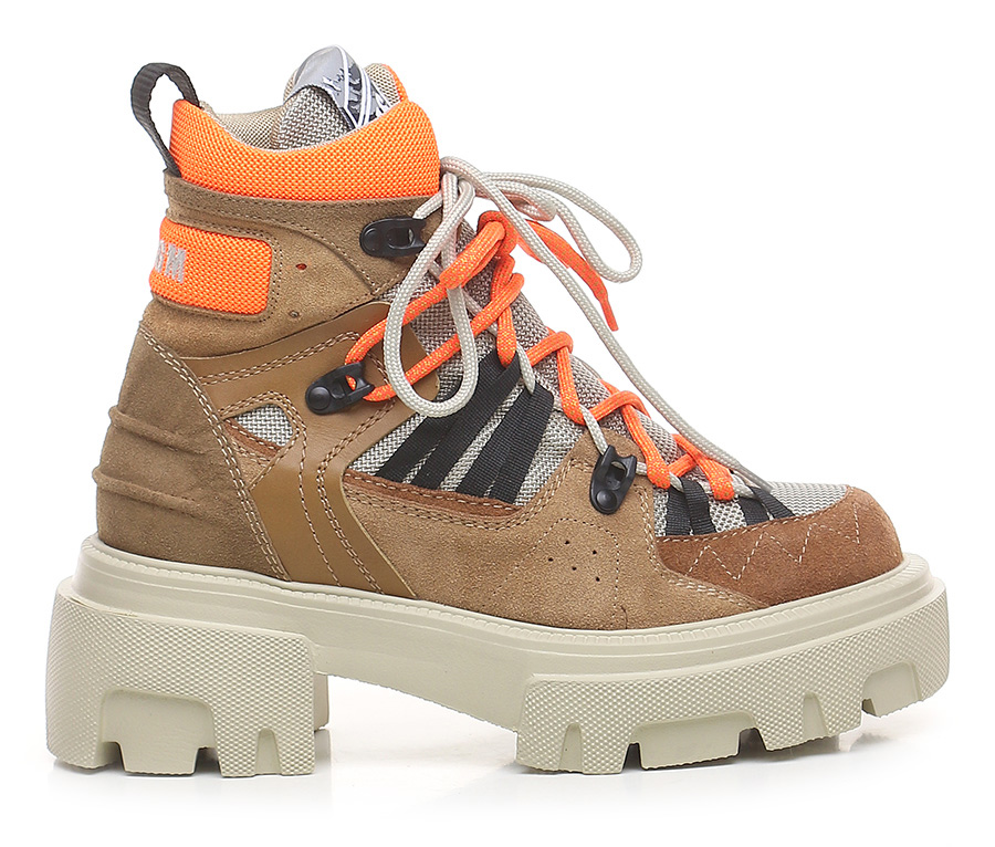 Suede ankle boot with fabric and leather inserts. Rubber sole. 65mm heel height, 40mm platform with 25mm ledge.