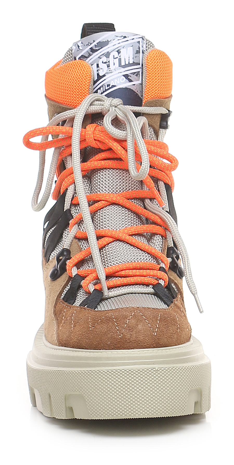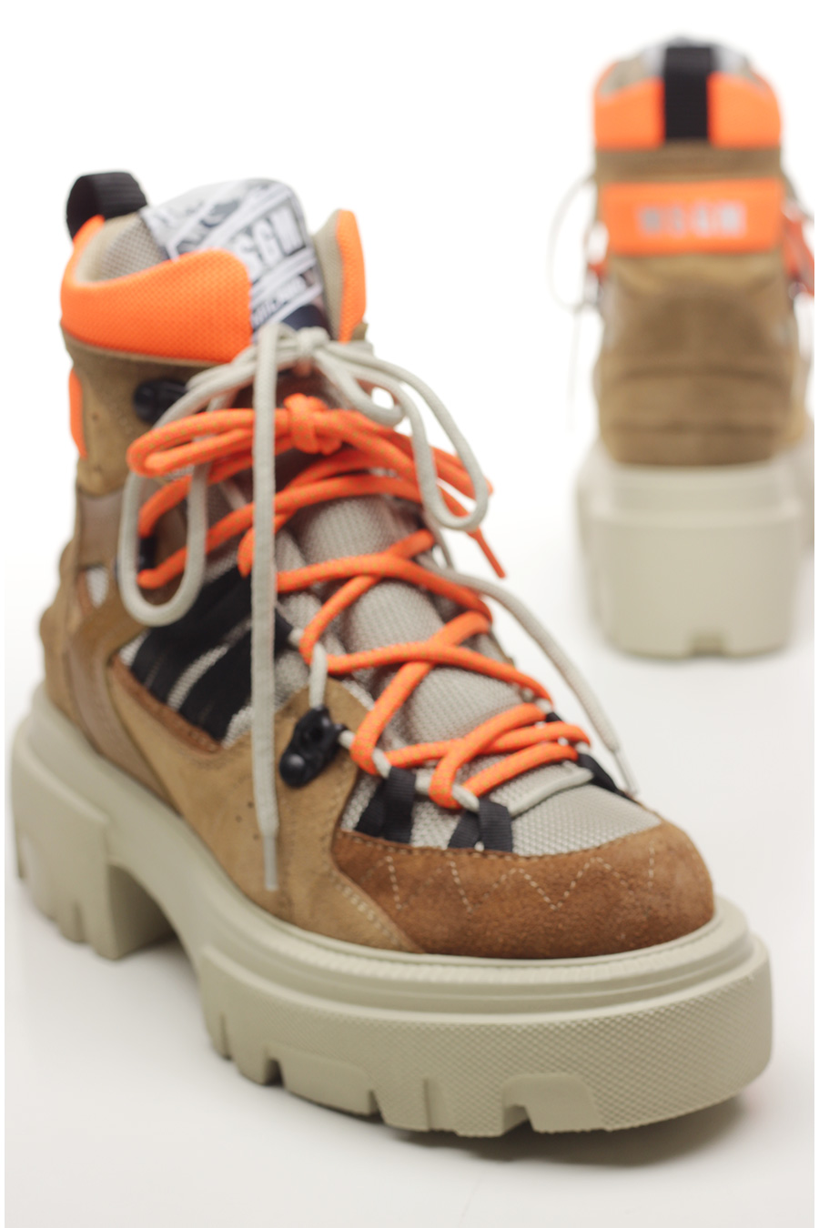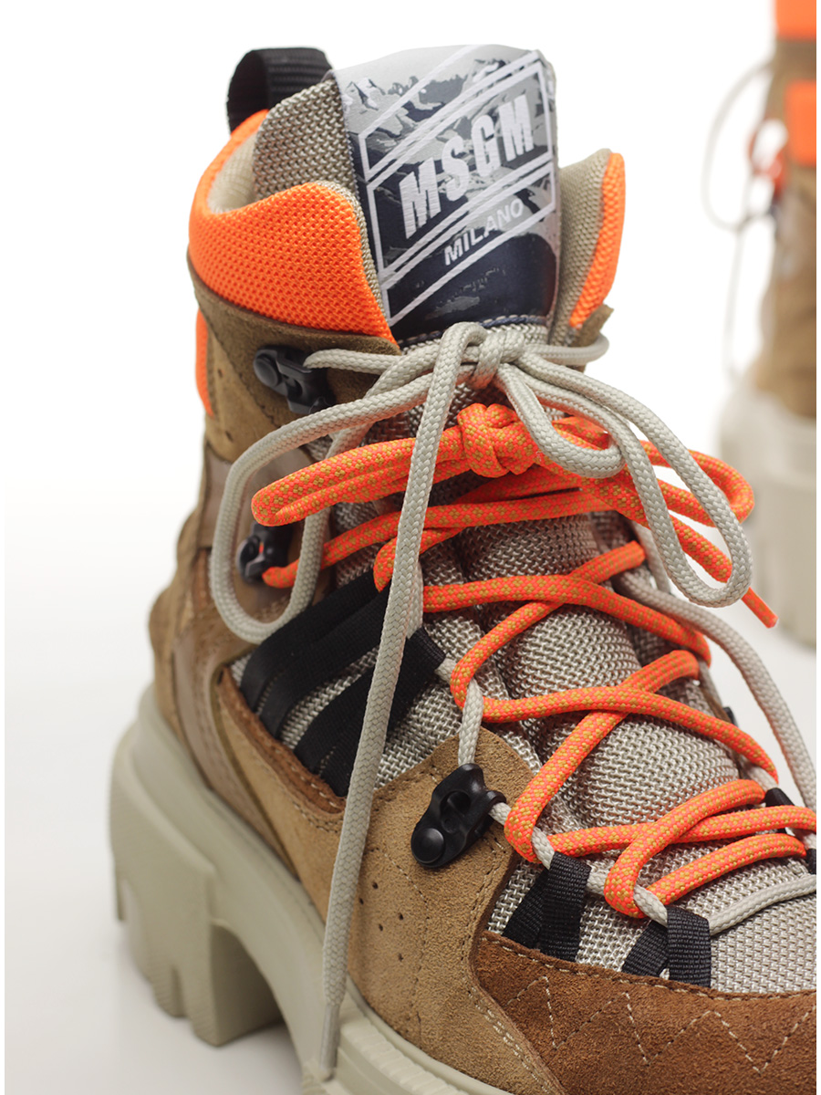 Suede ankle boot with fabric and leather inserts. Rubber sole. 65mm heel height, 40mm platform with 25mm ledge.