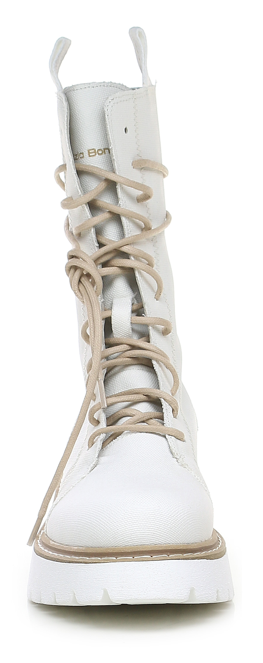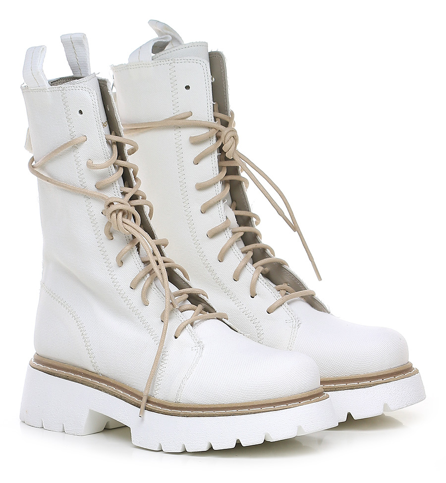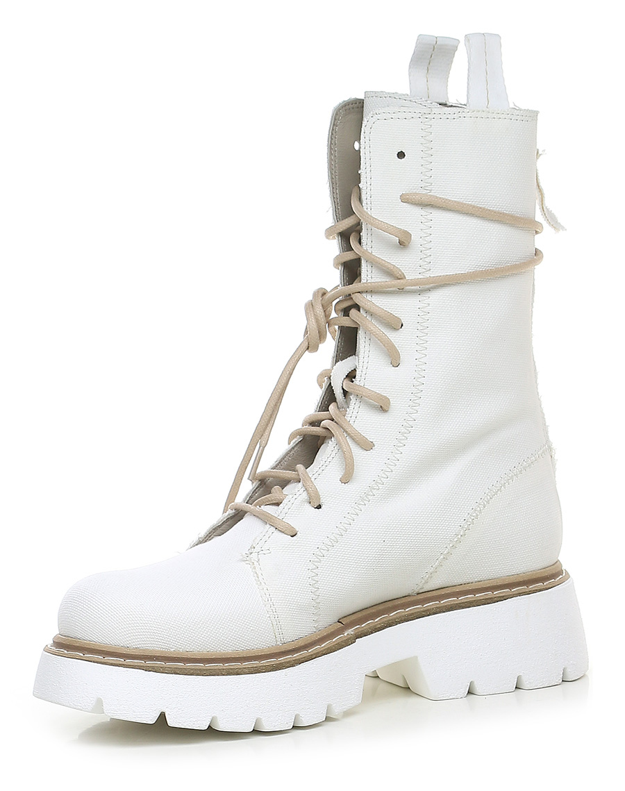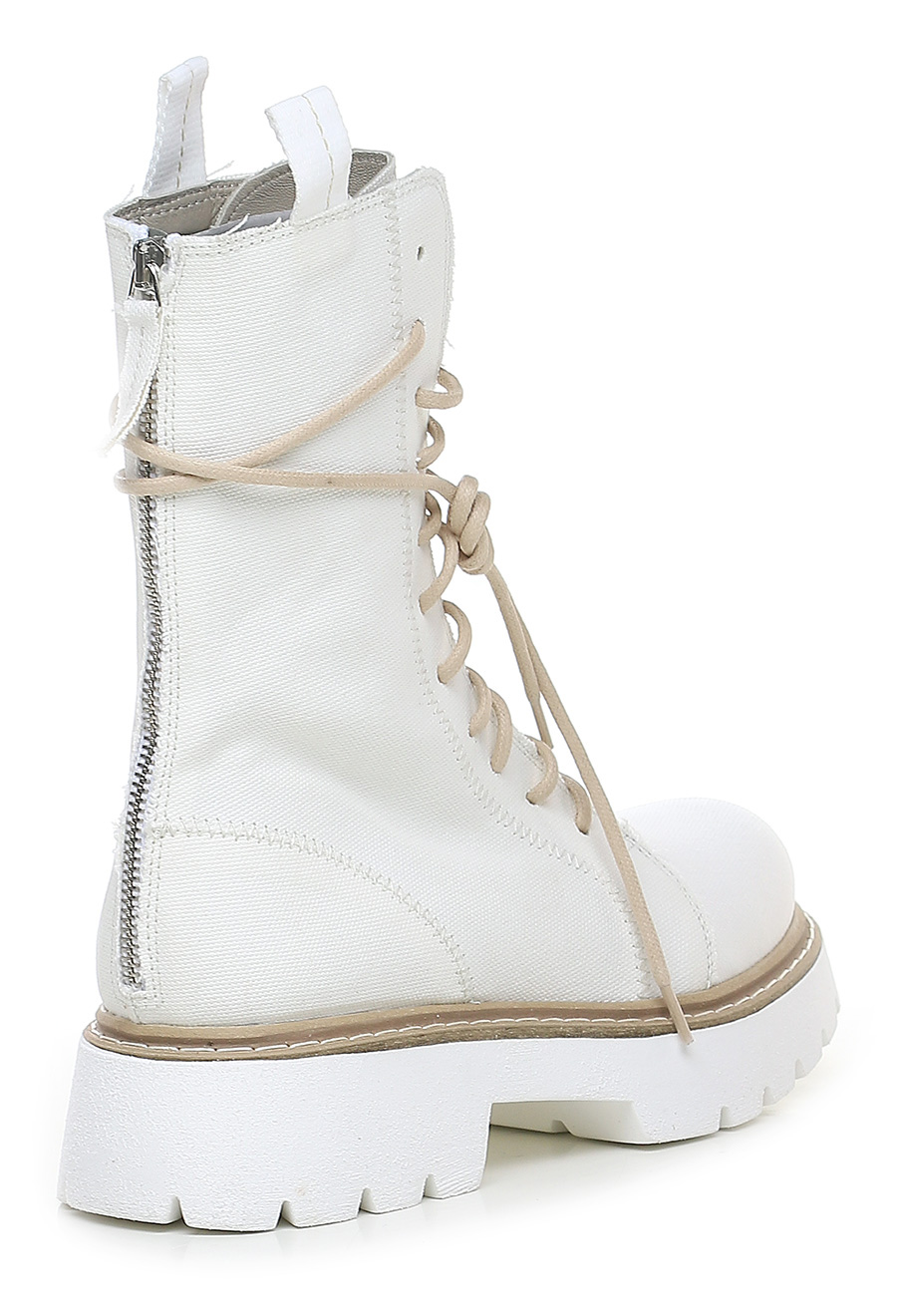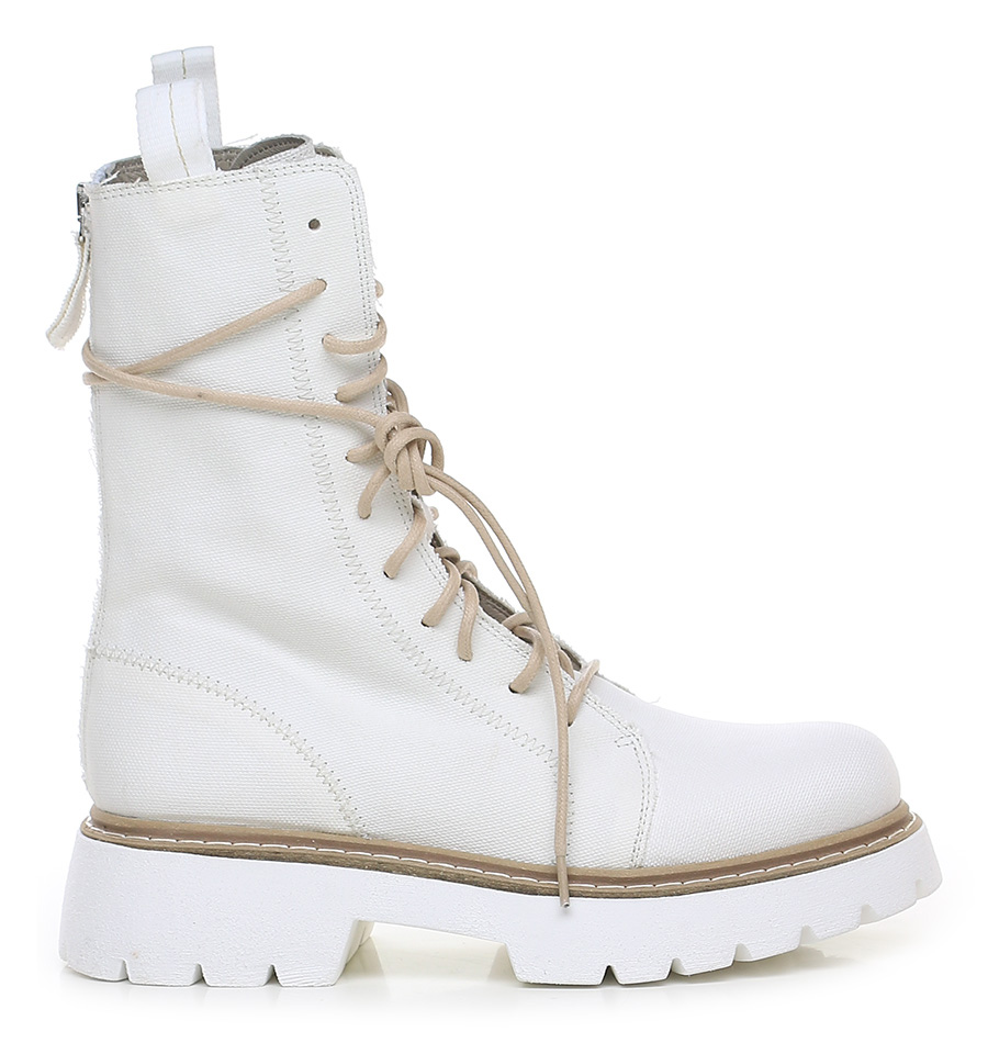 Fabric ankle boot with rear zip. Rubber sole: 50mm heel height, 30mm platform with 20mm ledge.