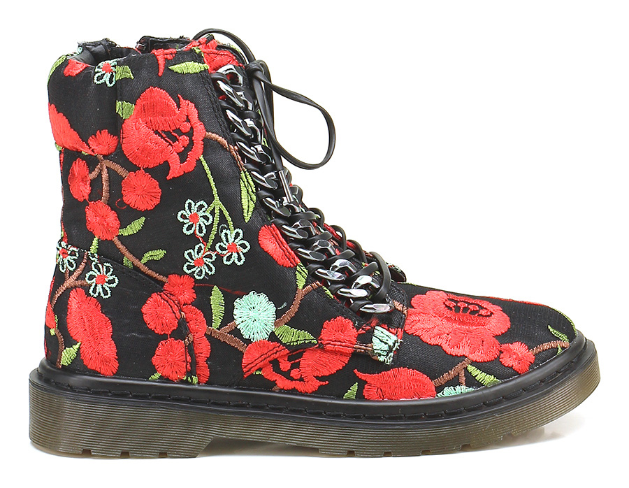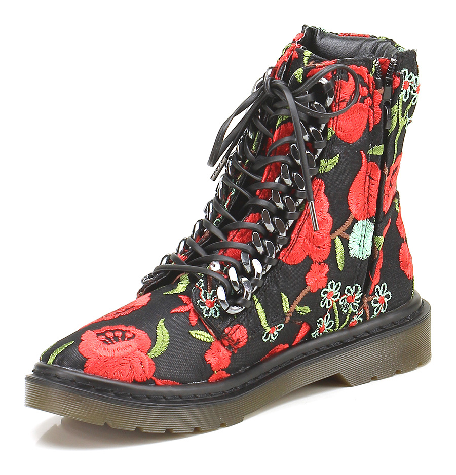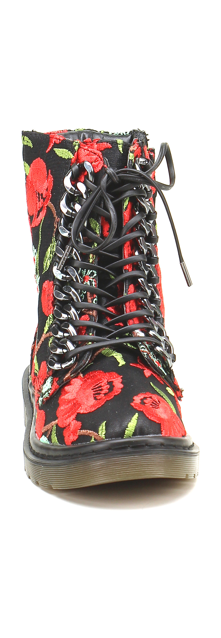 Ankle boot in fabric and eco leather with zip on the inside and embroidery on the upper. Rubber sole, 35 heel, 20 platform with 15 ledge.