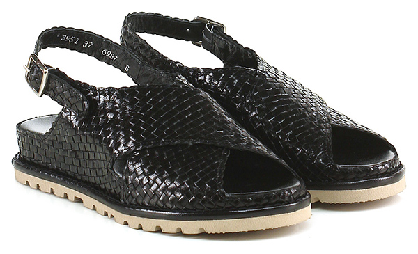 Sandalo basso in pelle intrecciata con cinturino su retro e suola in gomma. Tacco 35.
