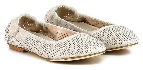 Scarpa bassa in camoscio forato con strass su tomaia e suola in gomma.
