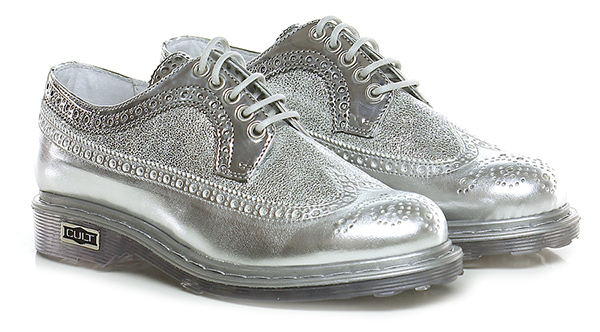 Scarpa bassa in pelle laminata effetto crack, pelle laminata ed eco pelle specchiata con lavorazione stile inglese e suola in gomma. Tacco 30, platform 15 con battuta 15.