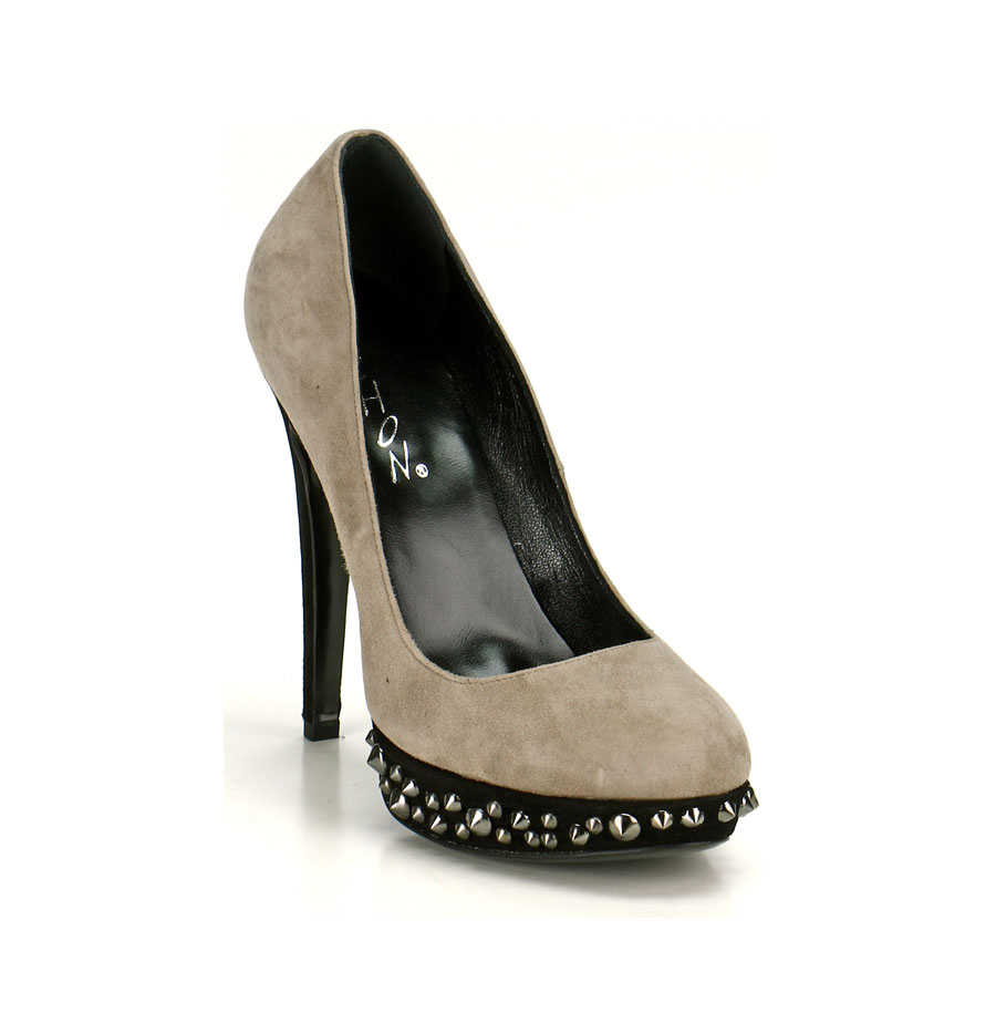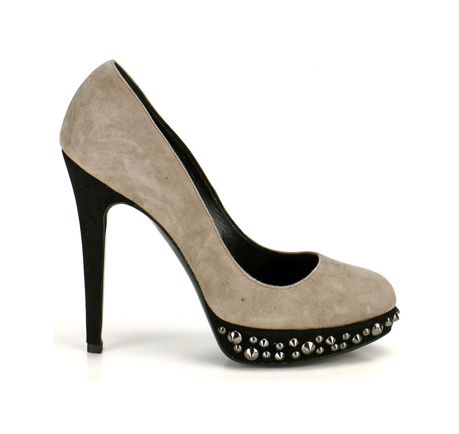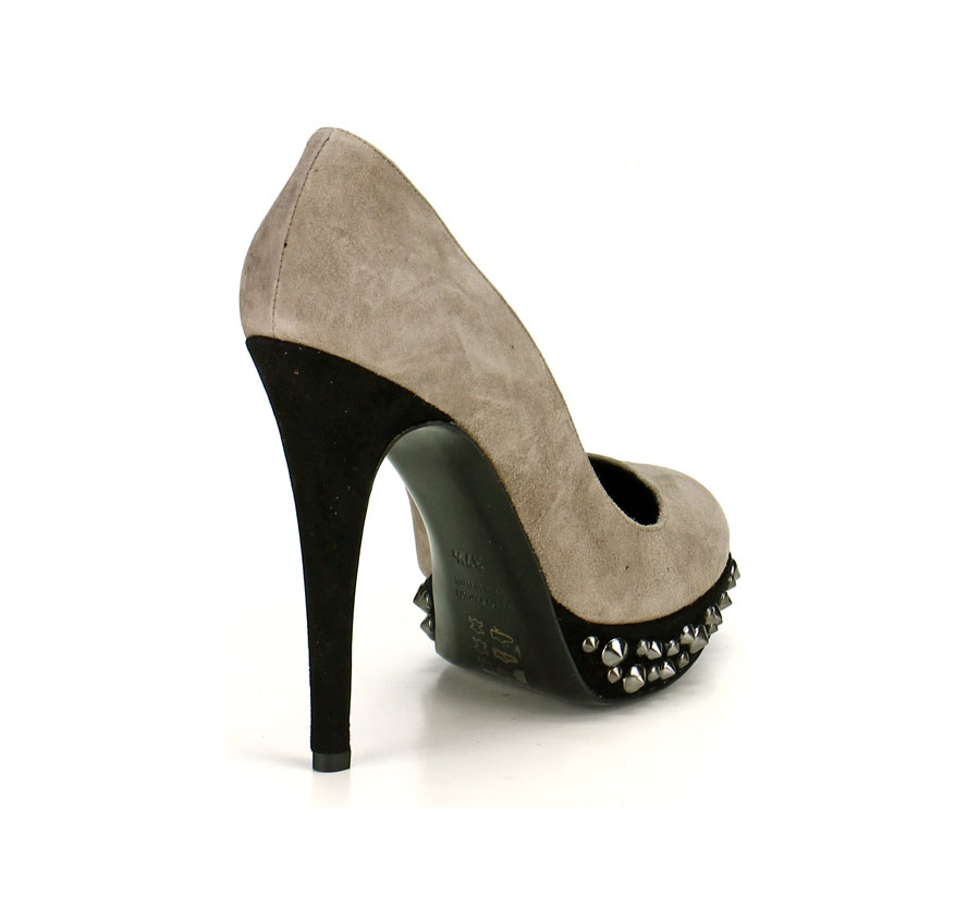 Decollete in suede and studs with leather sole. 130 heel, 25 platform with 105 ledge.