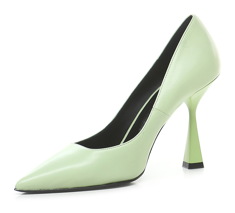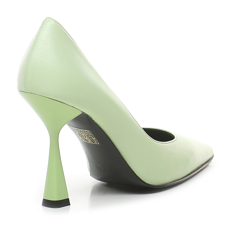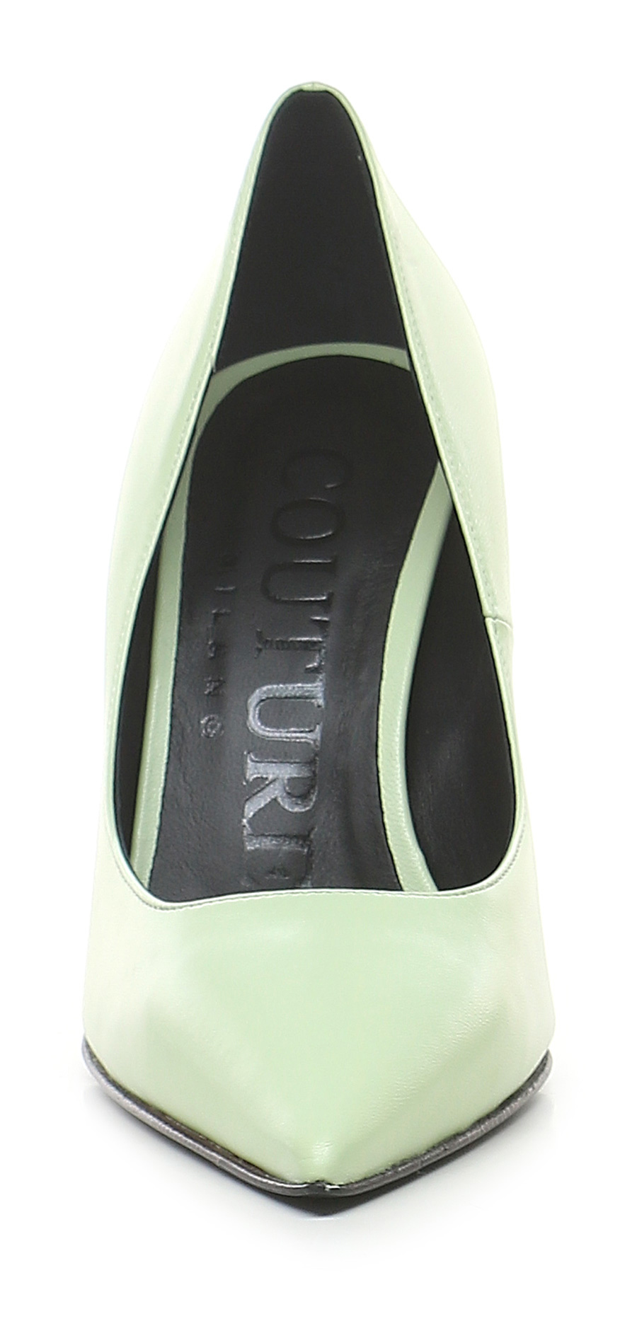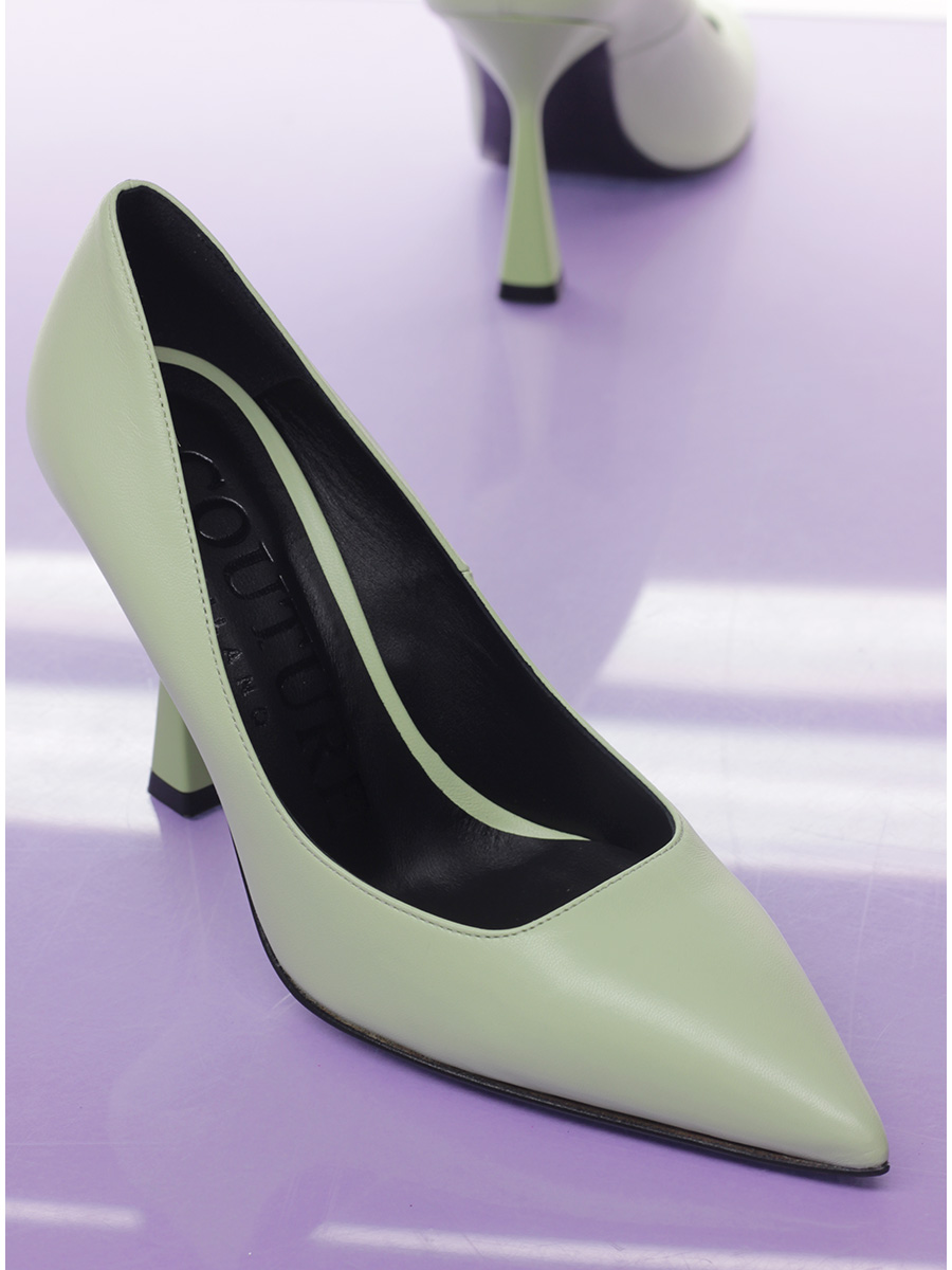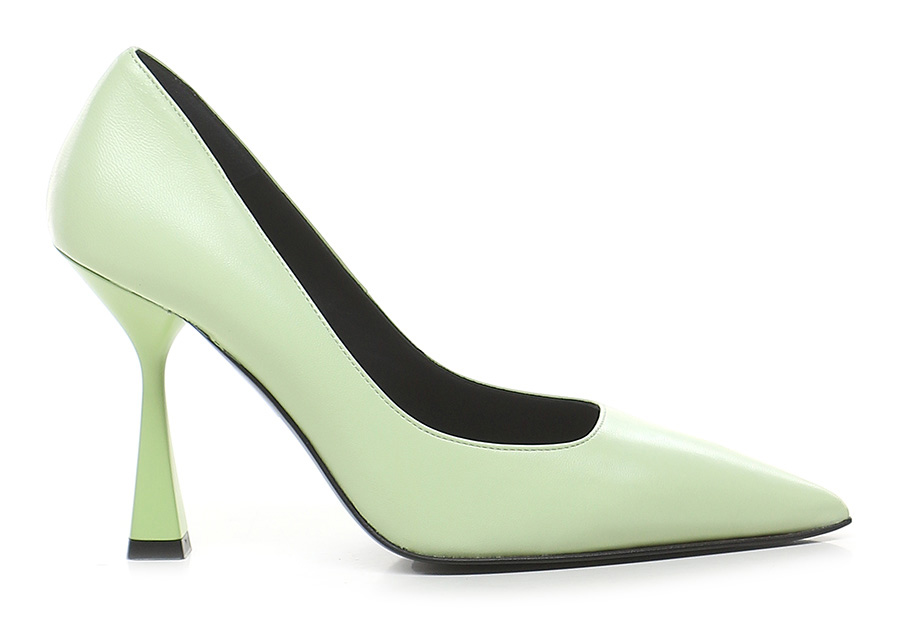 Decollete in leather with leather sole. Heel height 95mm. Spool heel in opaque effect PVC.