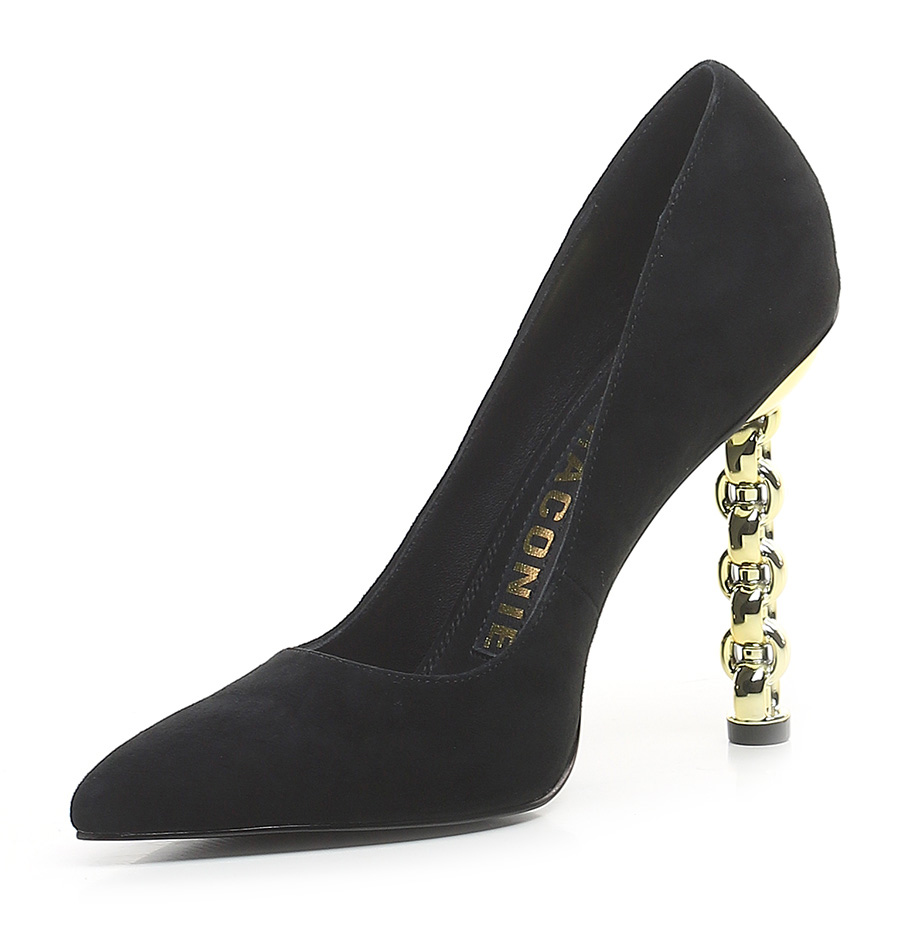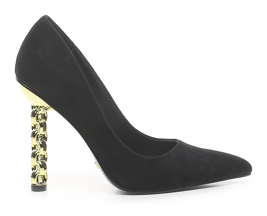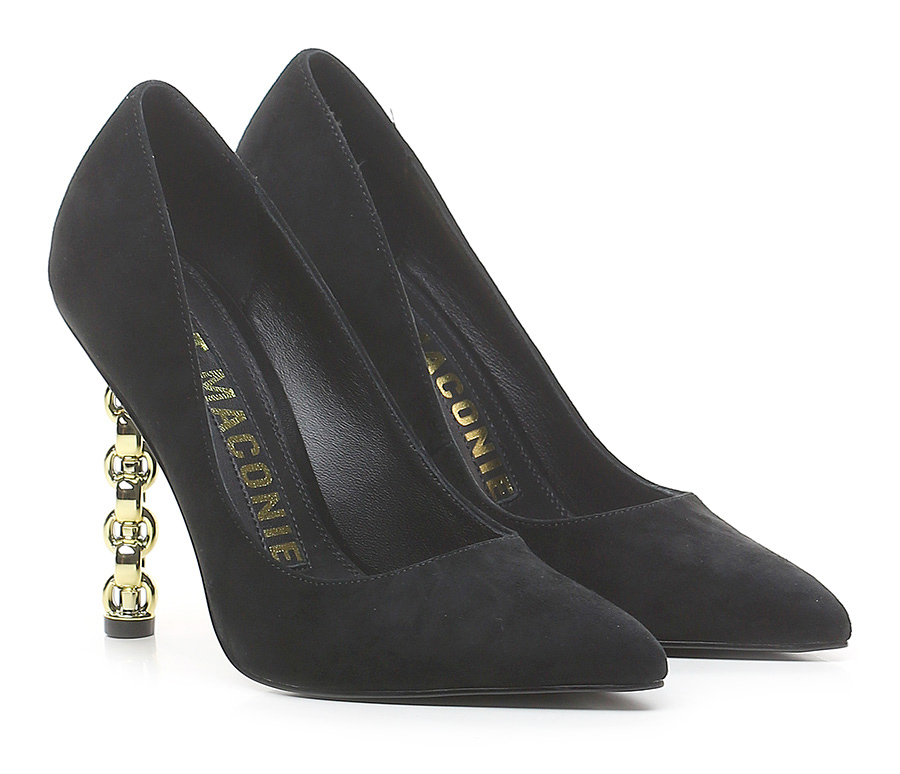Decollete in suede with rubber sole. Heel height 110. Pvc worked heel with metal effect.