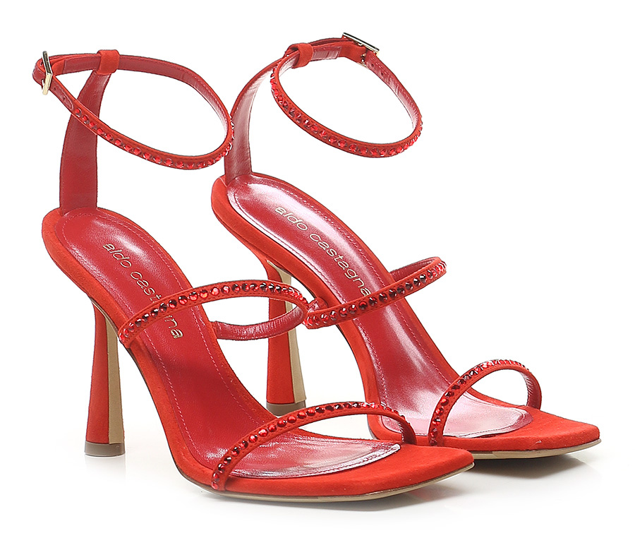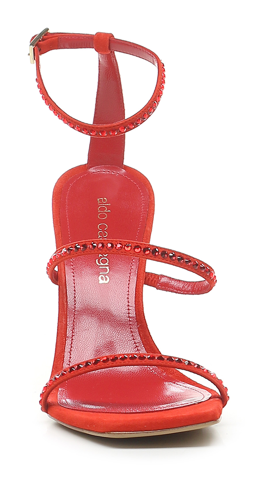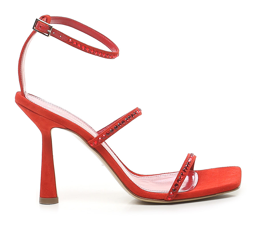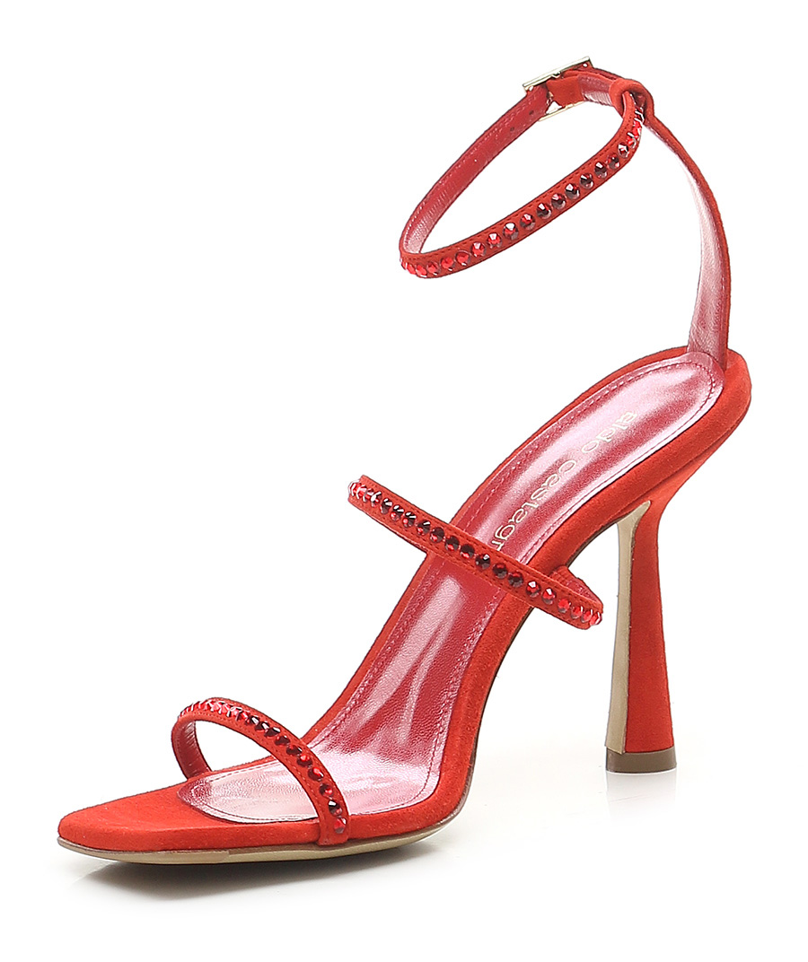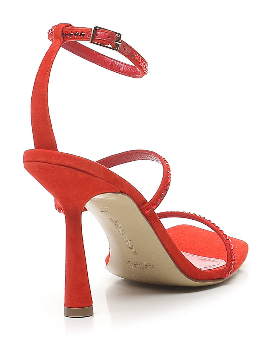 Suede sandal with ankle strap. Rhinestones on the upper. Leather and rubber sole. Heel height 105mm.
