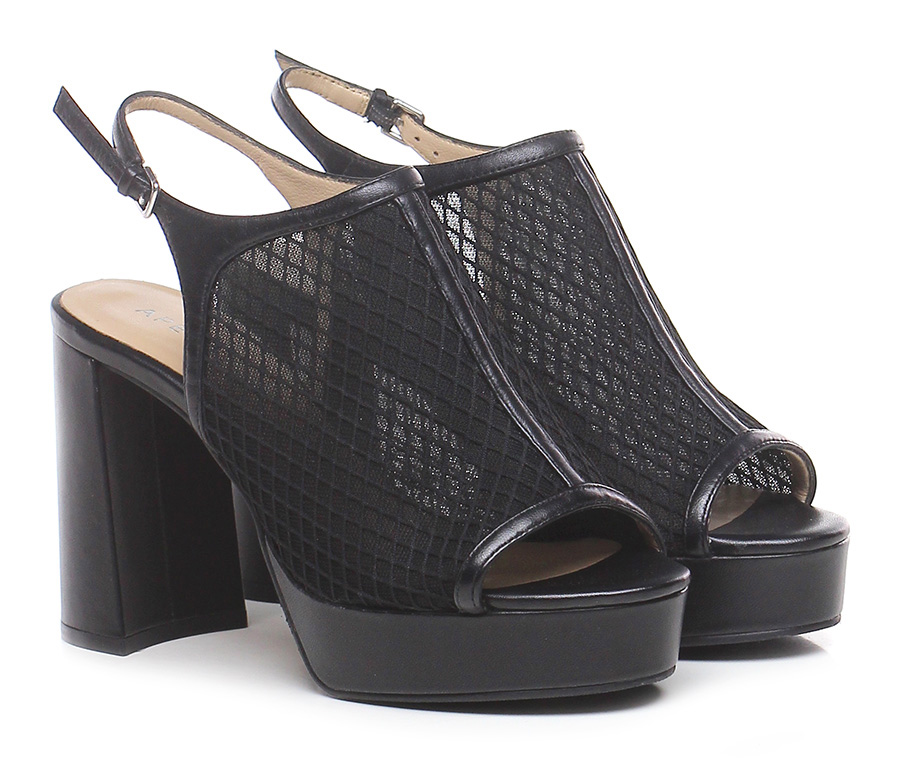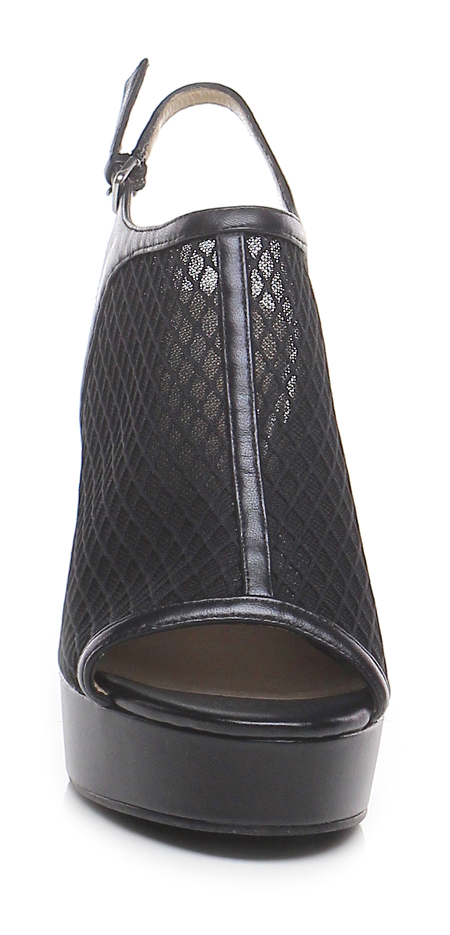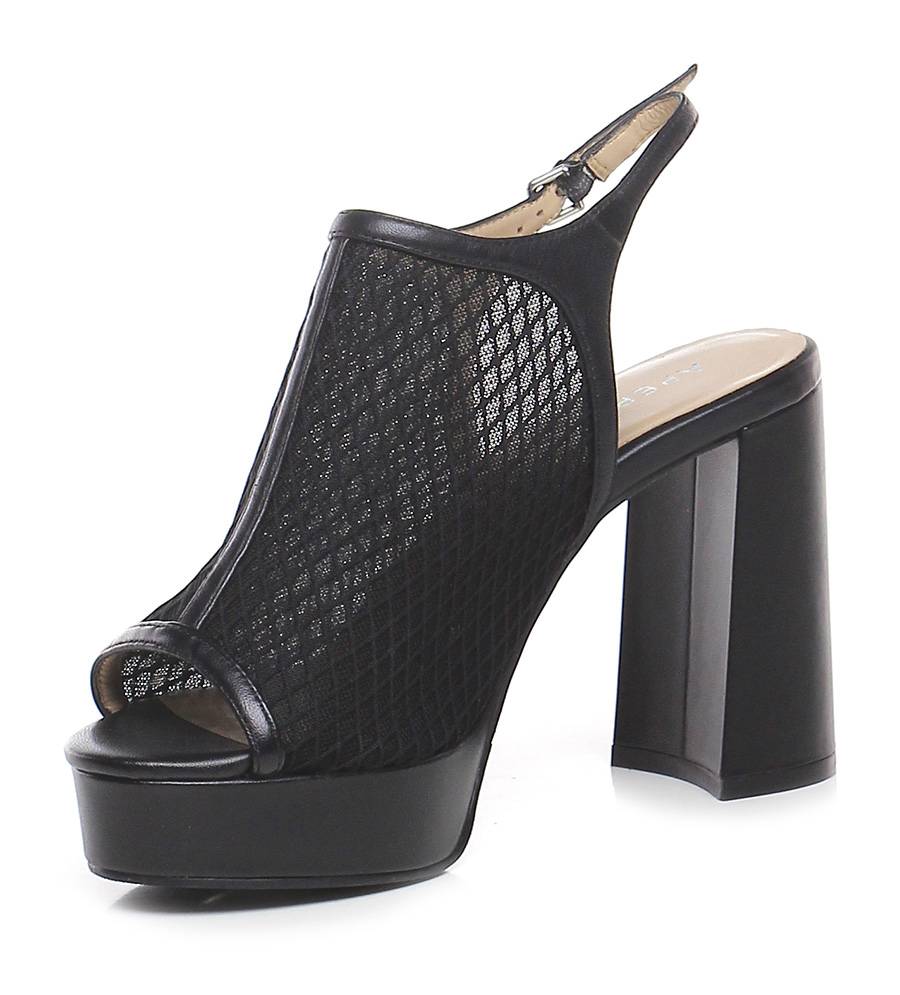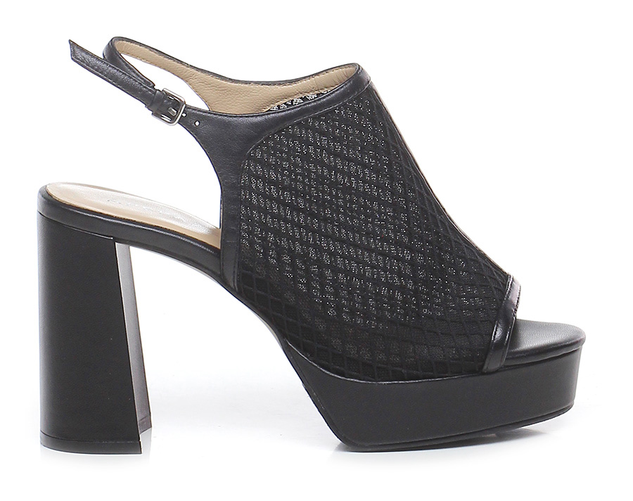 Sandal in leather and mesh fabric with ankle strap. Heel 105, platform 30 with ledge 75. Heel and platform covered in leather.