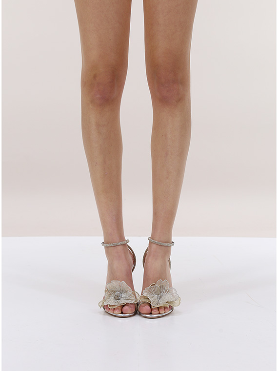 Sandal in mirrored leather and rhinestones with ankle strap. Leather sole: heel height 115mm. Mirrored leather lined heel.