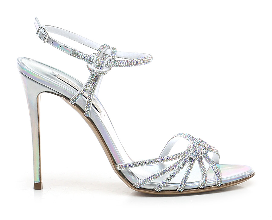 Sandal in fabric with rhinestones and ankle strap in iridescent effect leather. Leather sole. Heel height 115mm.