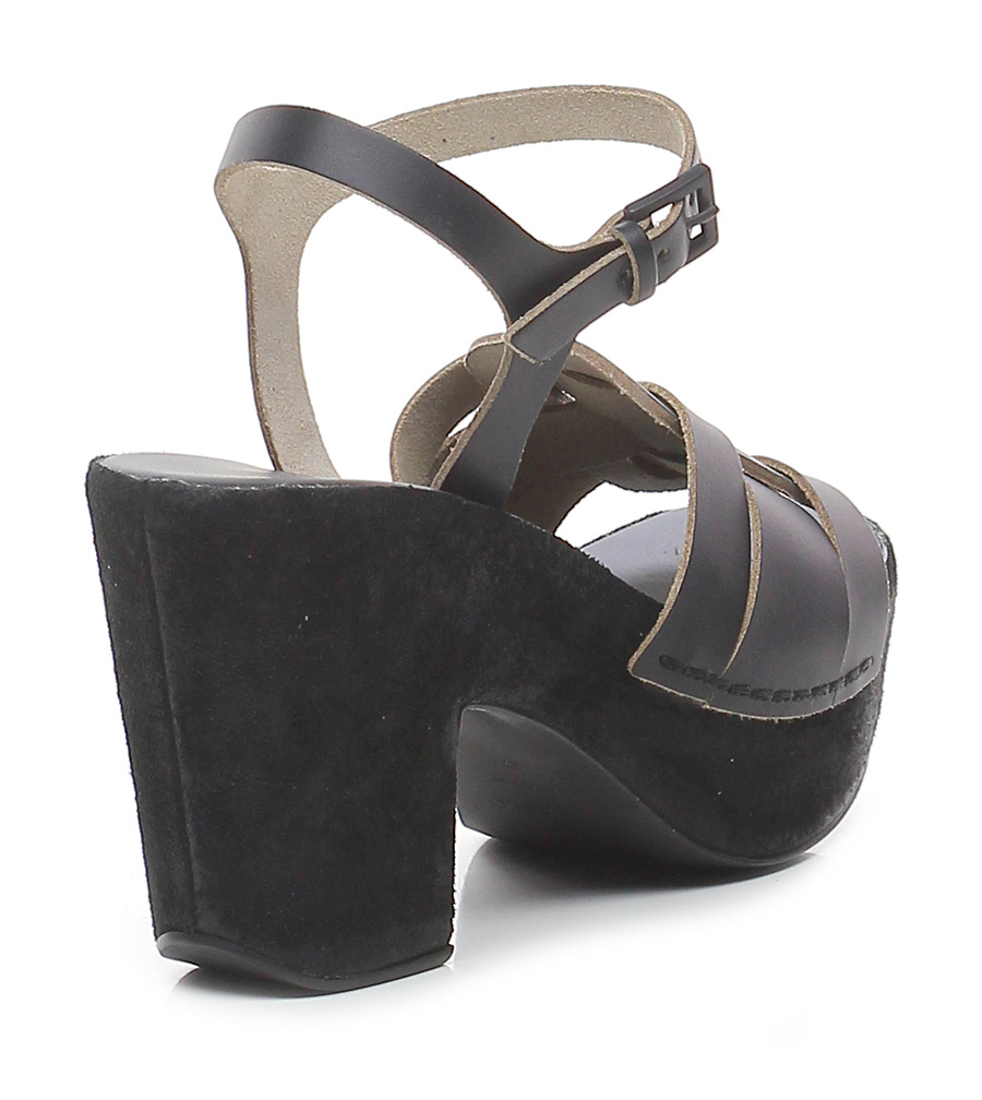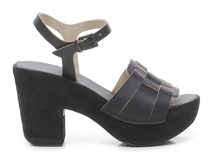 High leather sandal with ankle strap, rubber sole. Heel 100, platform 50 with ledge 50. Platform covered in suede.