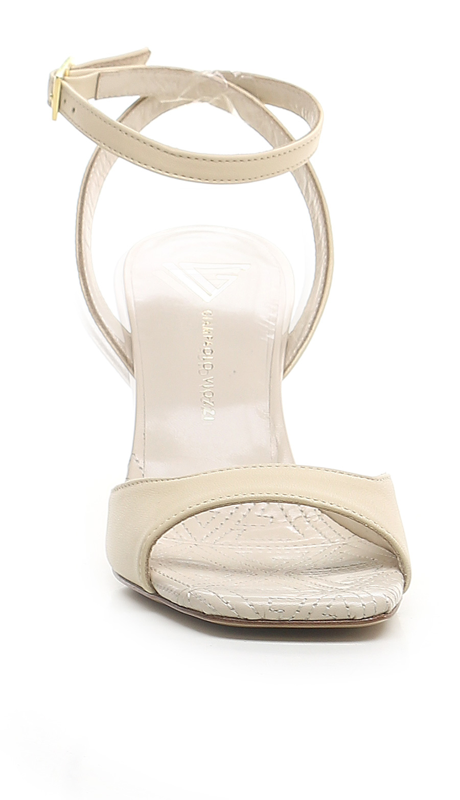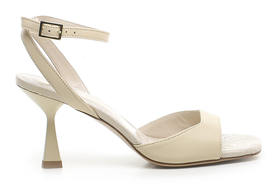 Leather sandal with ankle strap and leather sole. Heel height 80mm. Spool heel in opaque effect PVC.