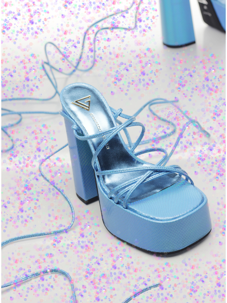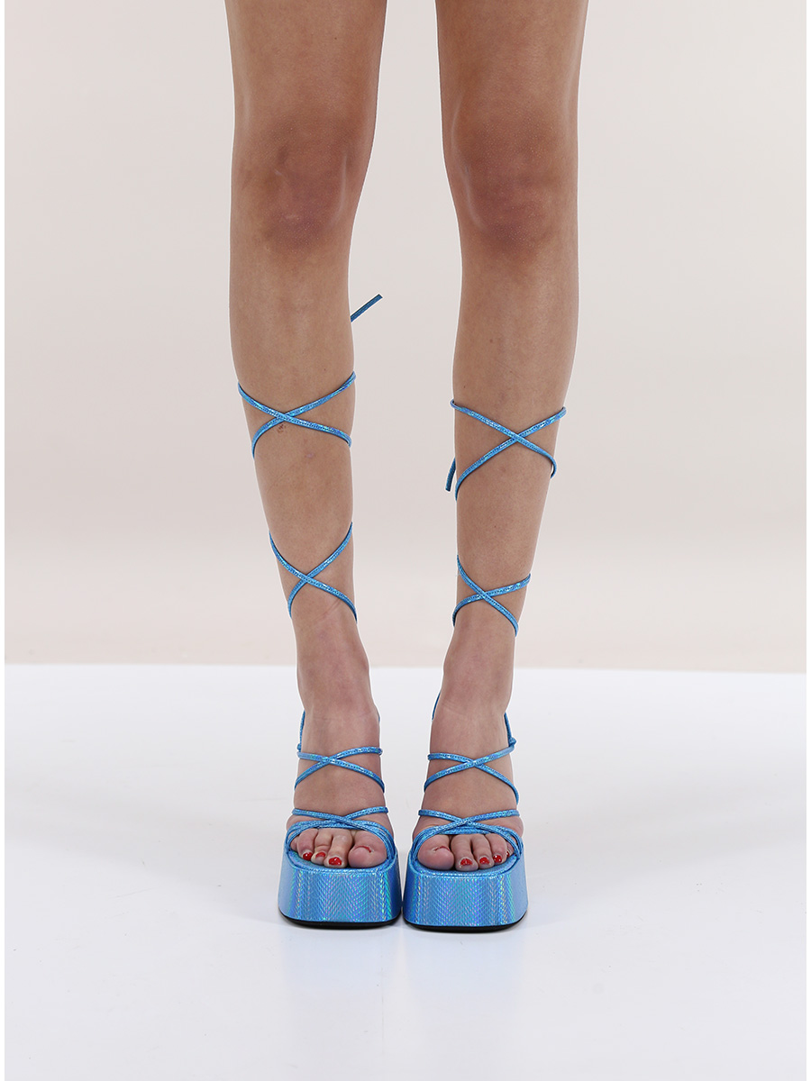 Sandalo in pelle laminata stampa pitone con laccio alla caviglia e suola in gomma. Altezza tacco 140mm, platform 50mm con battuta 90mm. Tacco foderato in pelle laminata stampa pitone.