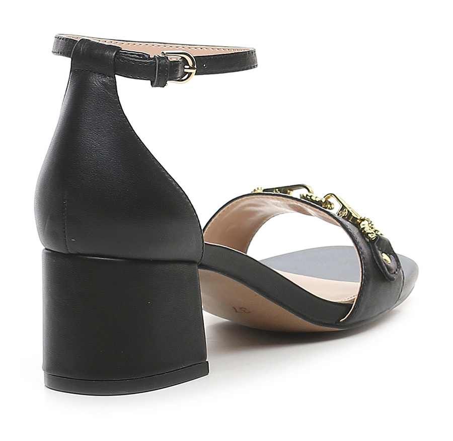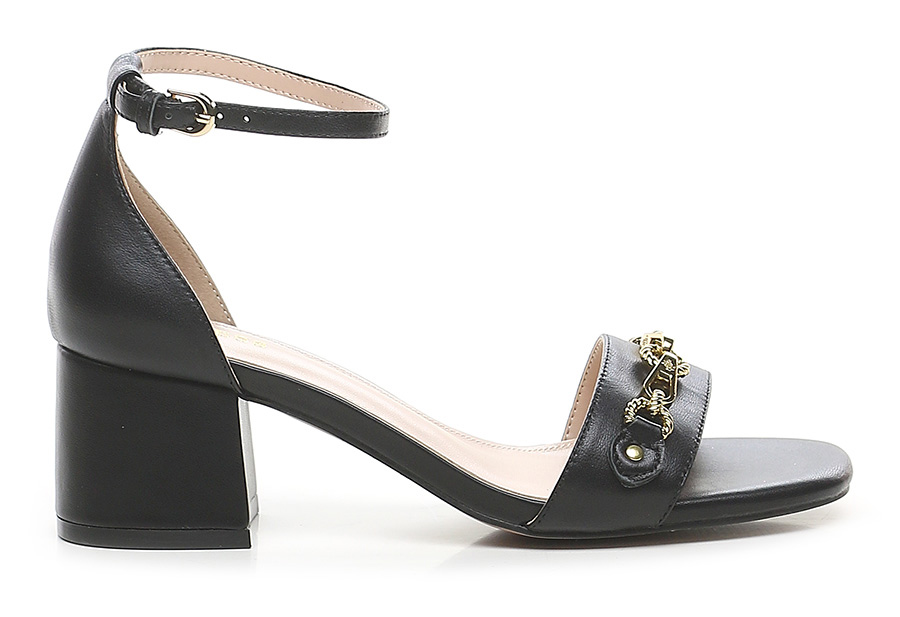 Leather sandal with ankle strap and front gold metal accessory. Rubber sole. Heel height 60mm. Leather lined heel.