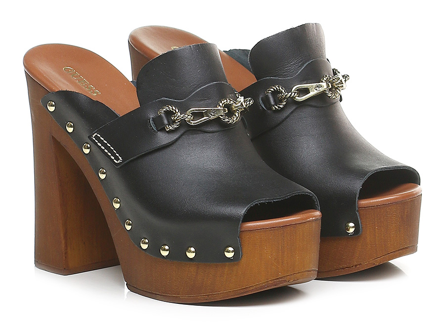 Leather sandal with front metal accessory and rubber sole. Heel height 130mm, platform 45mm with 85mm ledge. Wood effect heel and platform.
