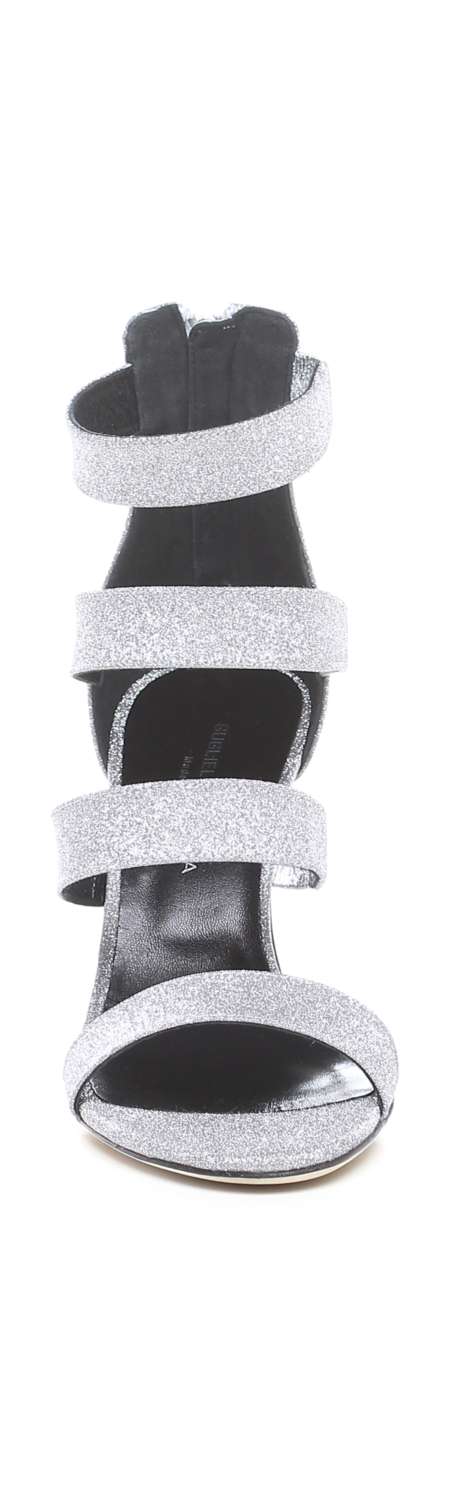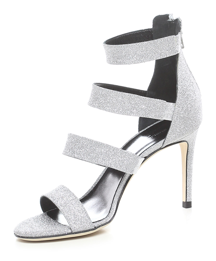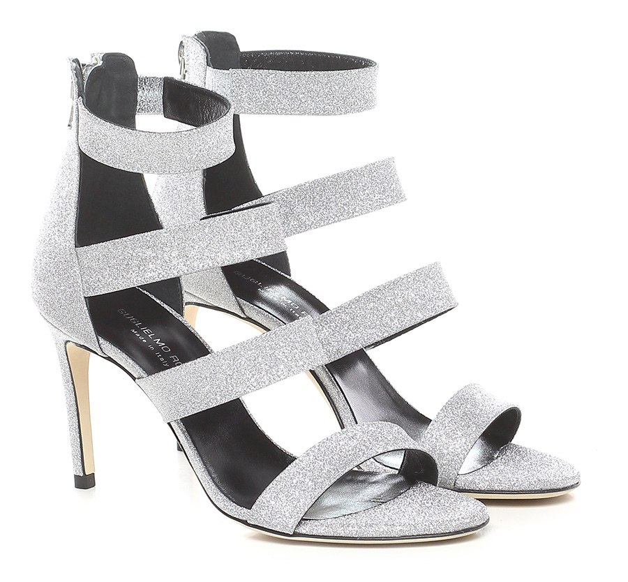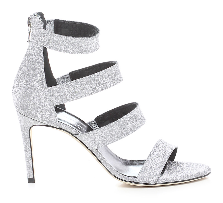 High sandal in glittery leather with zip on the back and leather sole. 90 heel.