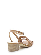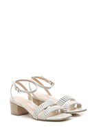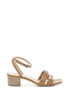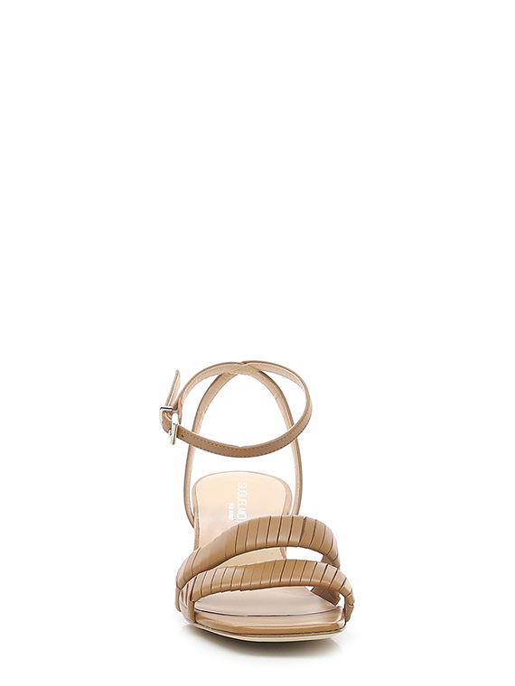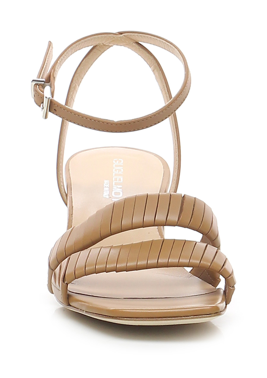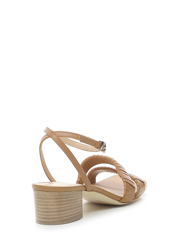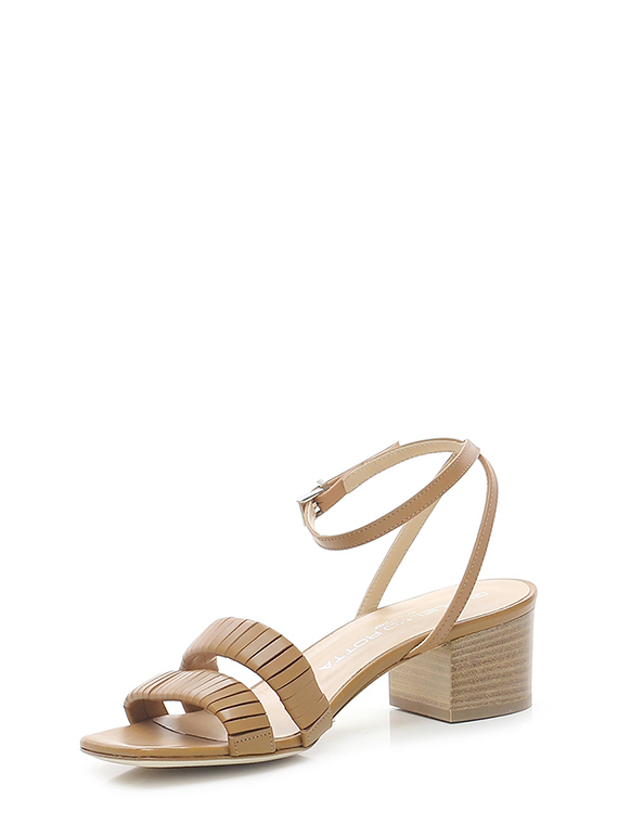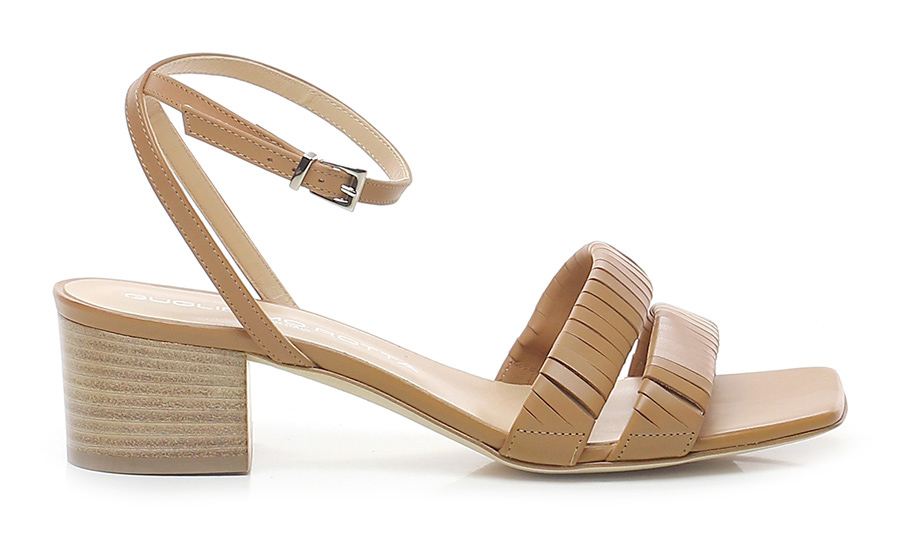 Flat sandal in worked leather with ankle strap, leather sole. Heel 50, wood effect.