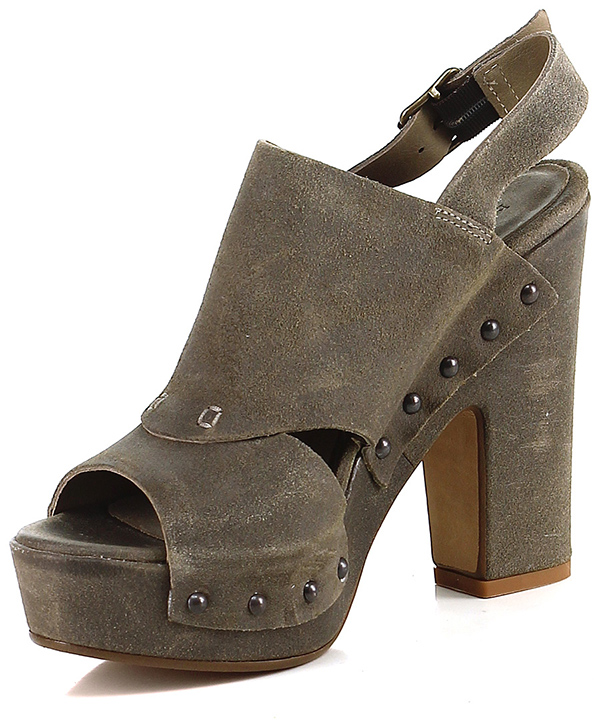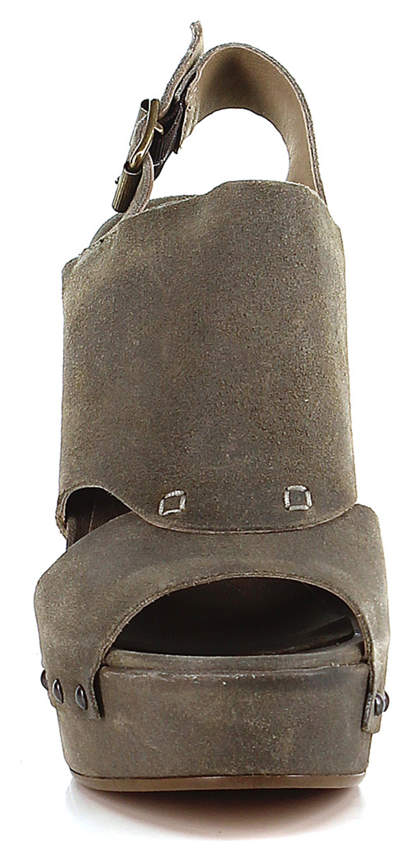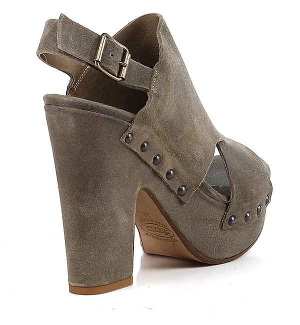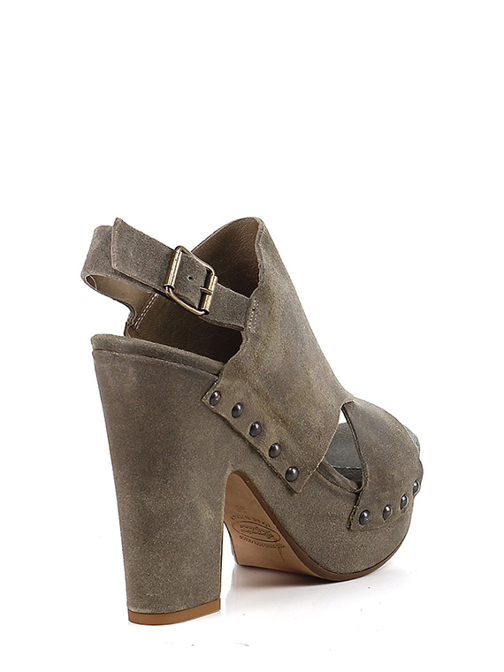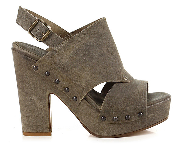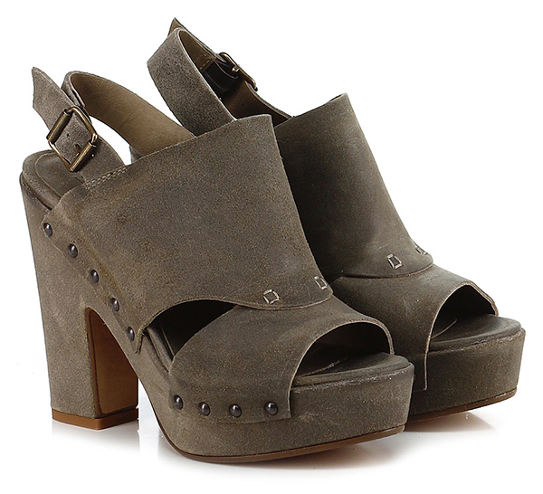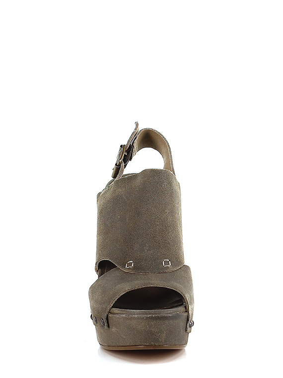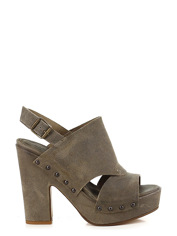 High sandal in vintage brushed effect crust leather with strap on the back. Leather sole, 125 heel, 40 platform with 85 ledge.