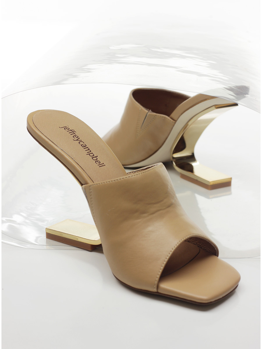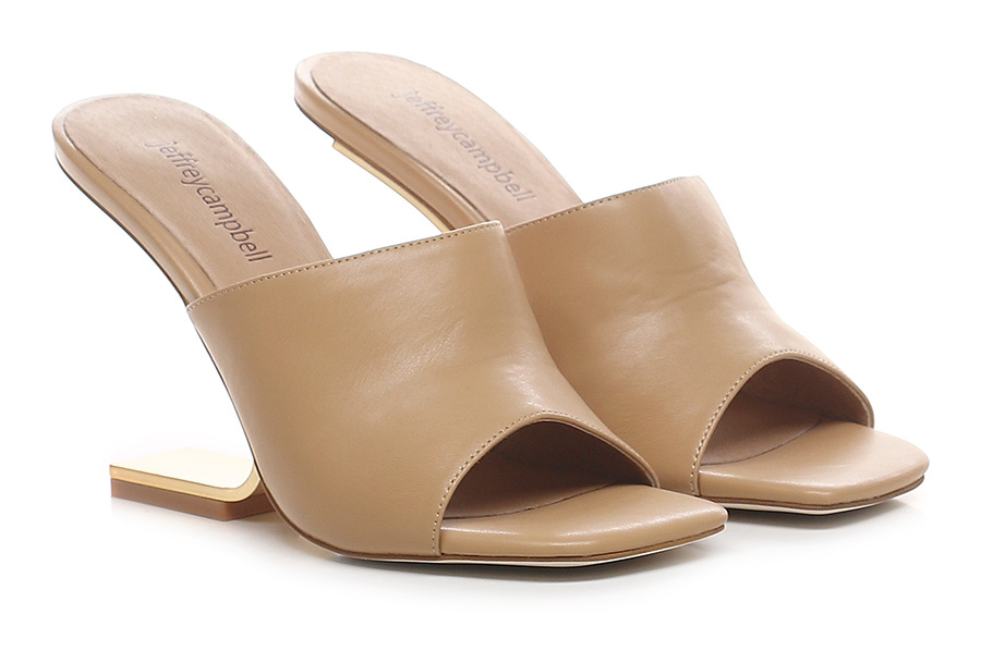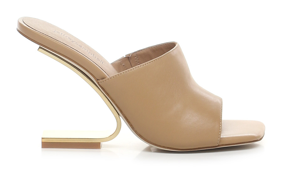 Faux leather sandal with rubber sole. Heel height 105mm. Gold metallic heel.