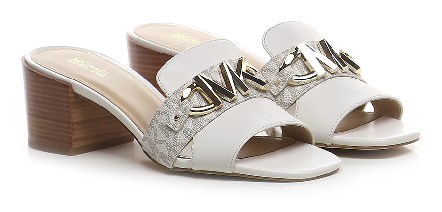 Sandal in leather and logoed faux leather with front metal logo. Rubber sole. Heel height 60mm. Wood effect heel.