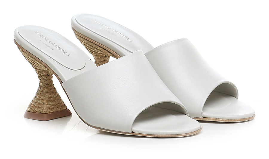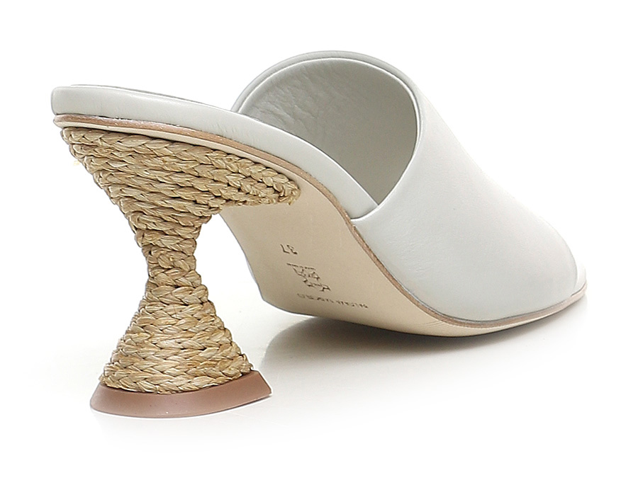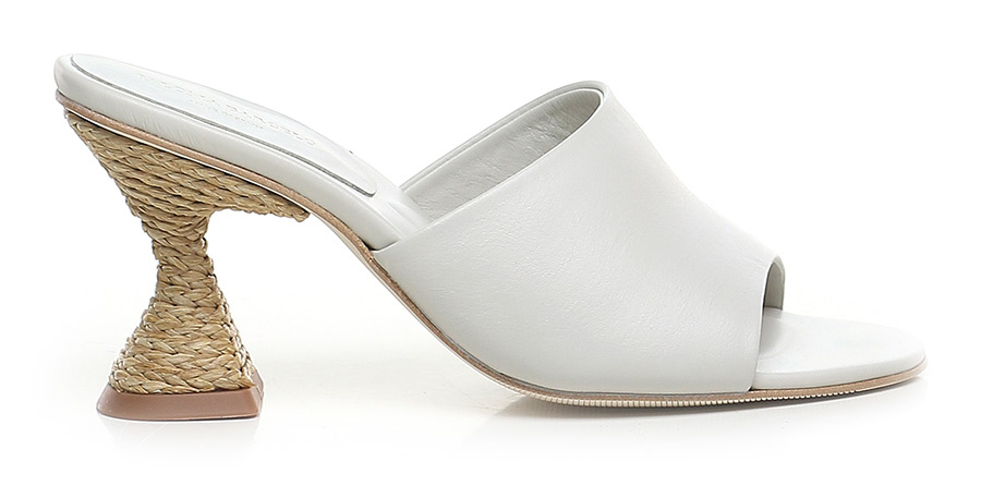 Leather sandal with leather and rubber sole. Heel height 90mm. Rope lined spool heel.