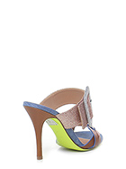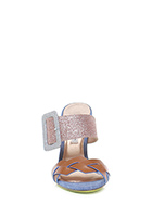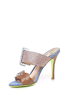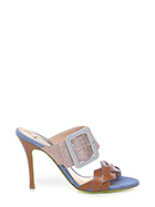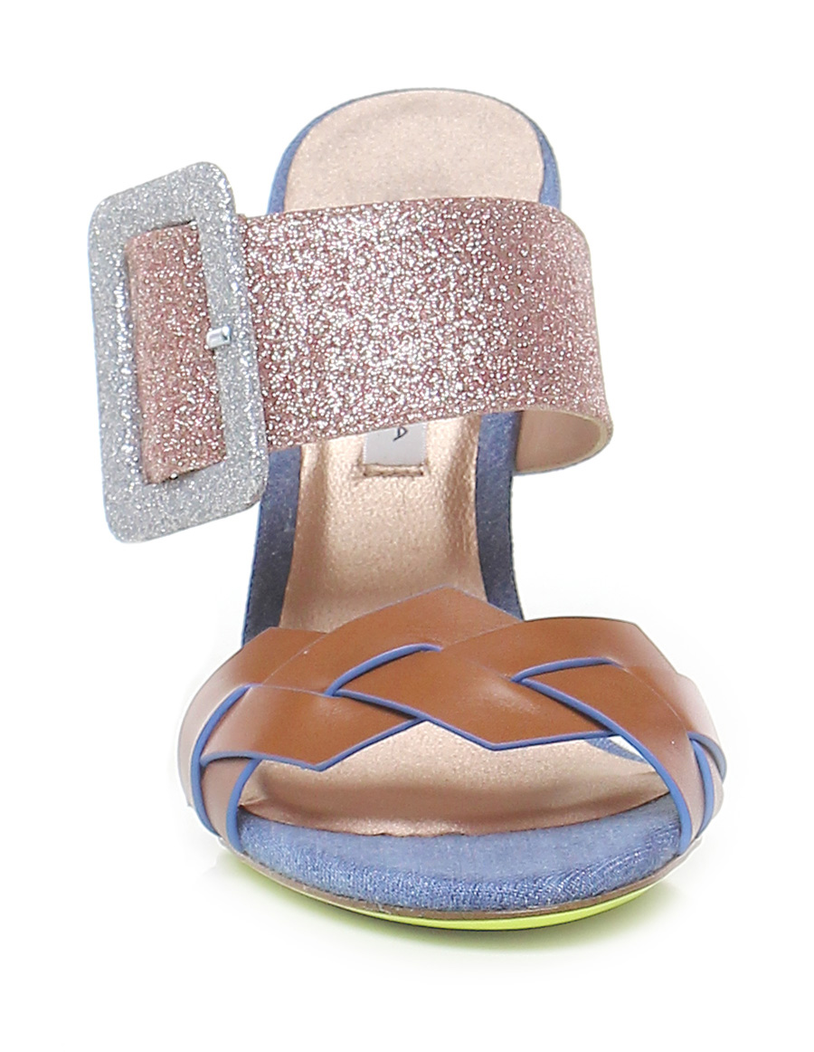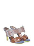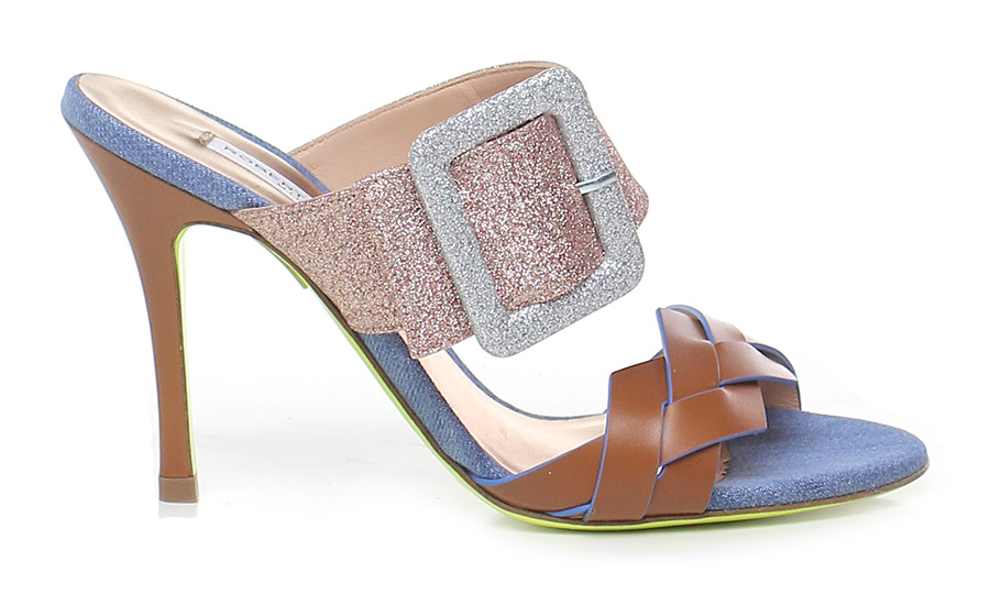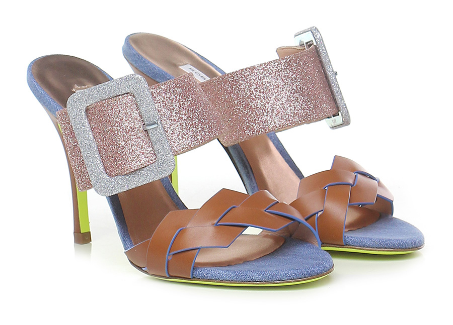 High sandal in leather with glitter and fabric, strap with front buckle, leather sole. 110 heel.
