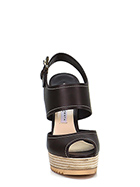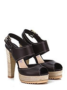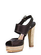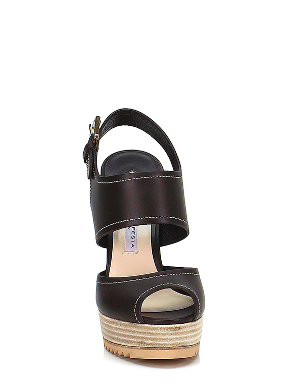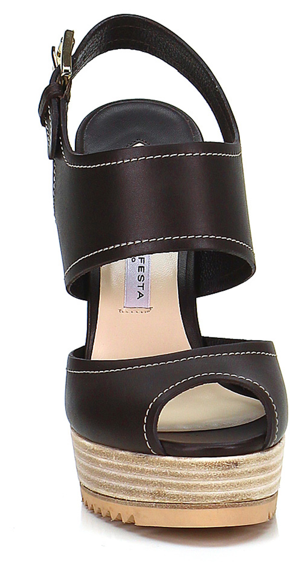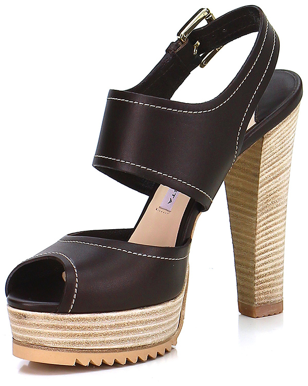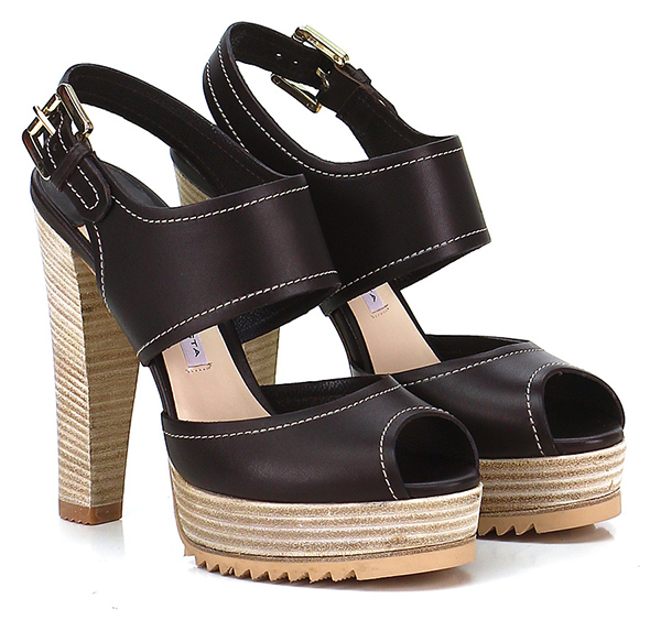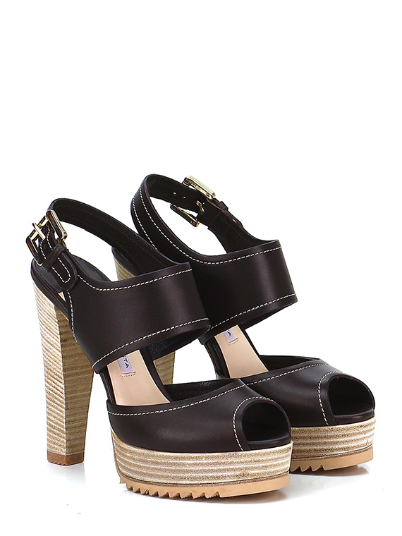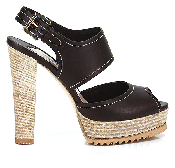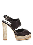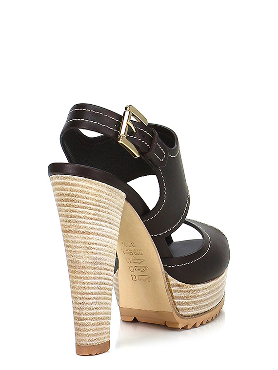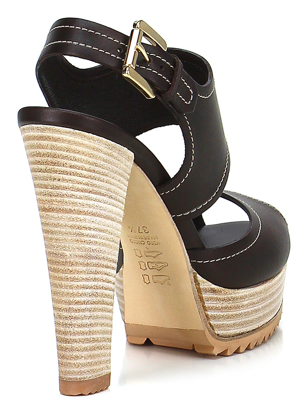 High leather sandal with back strap and leather and rubber sole. 130 heel, 30 platform with 100 ledge.