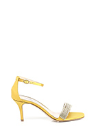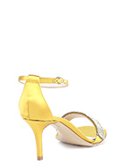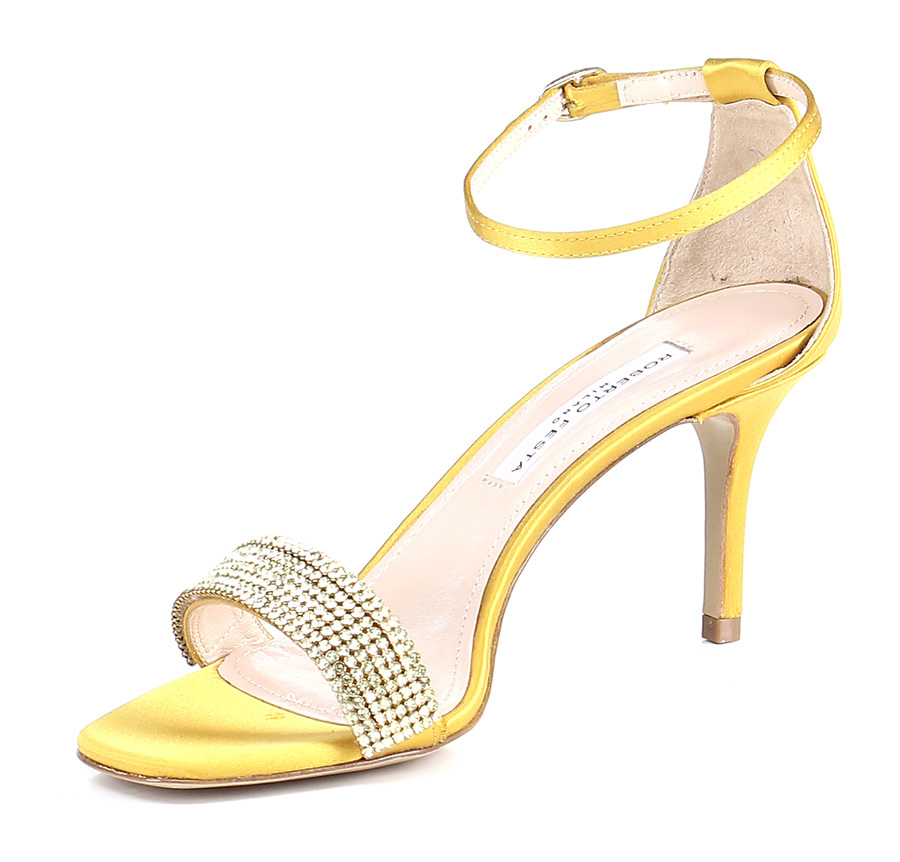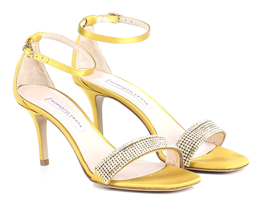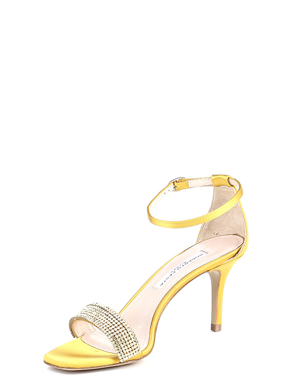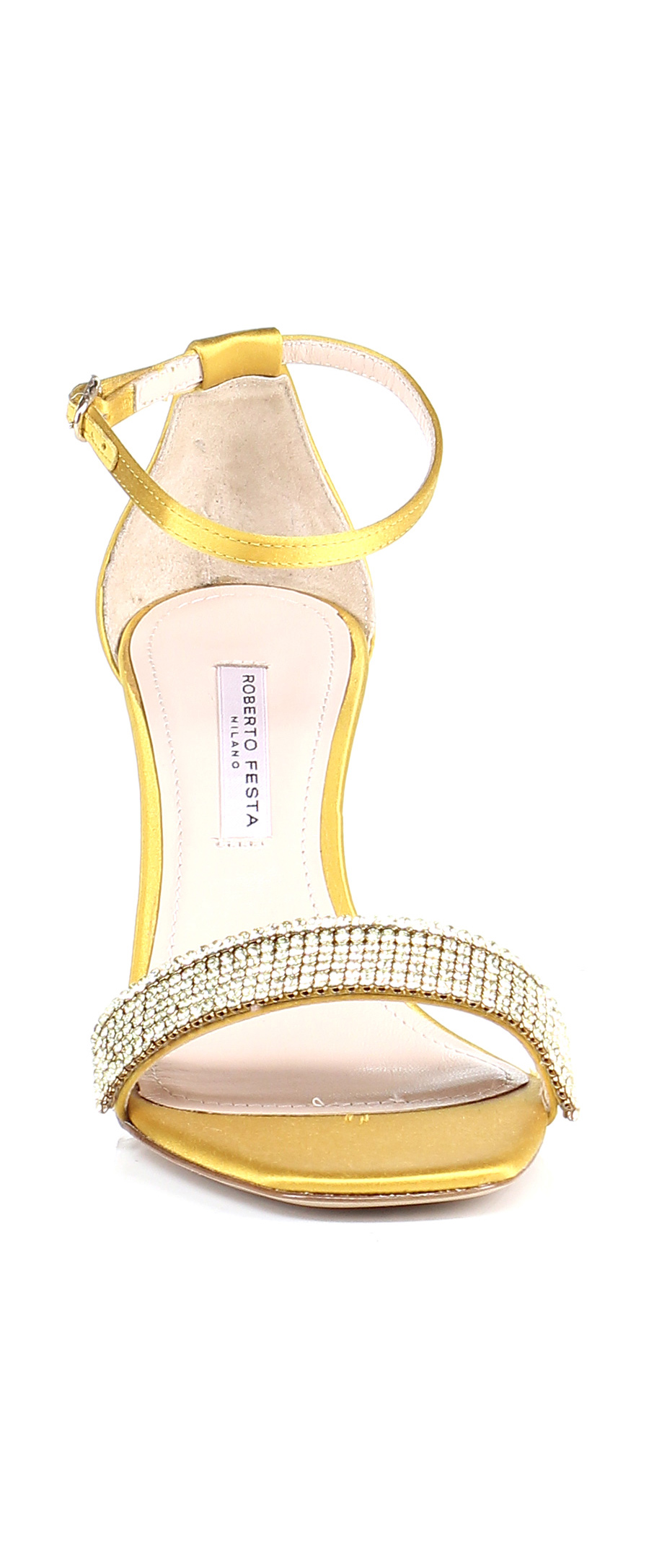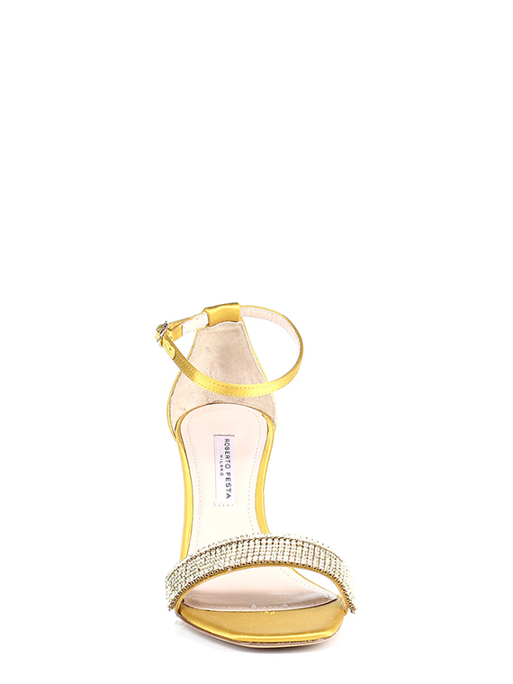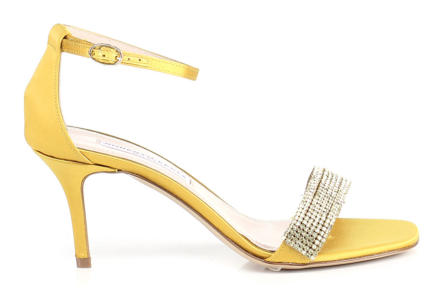 High sandal in satin fabric with ankle strap and front rhinestones. Leather sole, 75 heel.