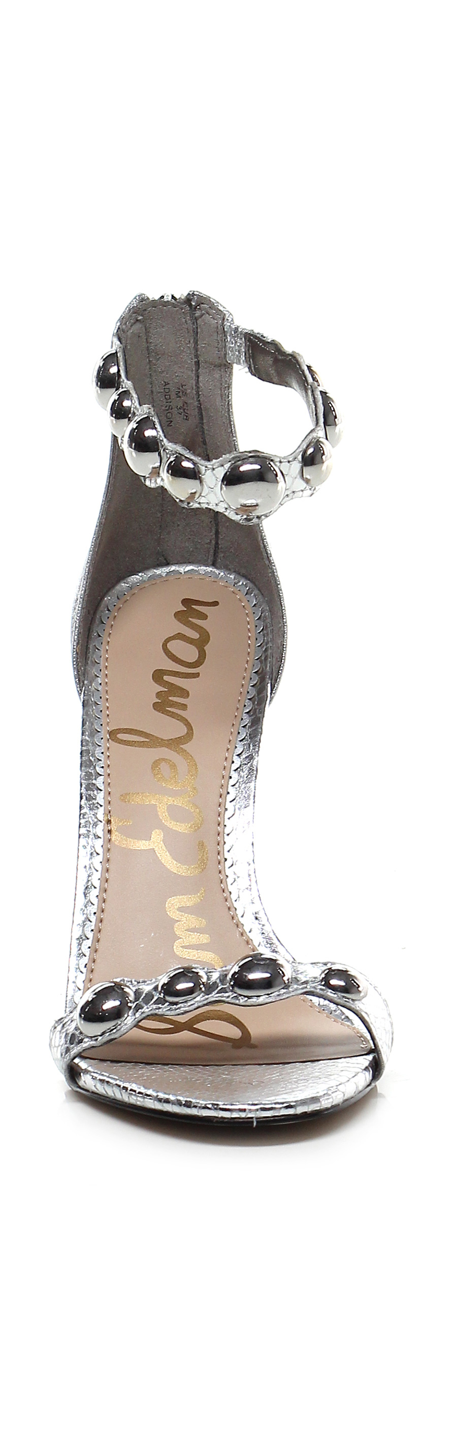 High sandal in reptile print laminated eco leather and eco leather with zip on the back and ankle strap with studs. Rubber sole, 110 heel.