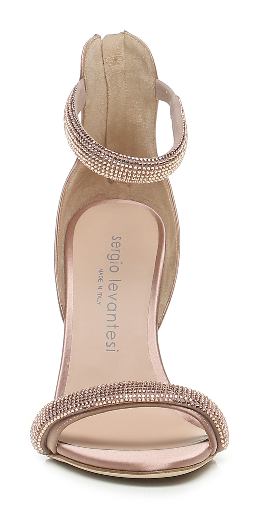 High sandal in satin fabric and rhinestones on the upper with ankle strap and zip on the back, leather sole. 105 heel.