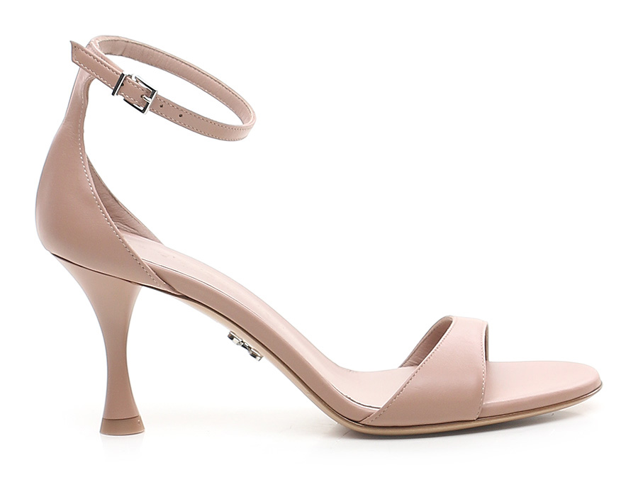 Leather sandal with ankle strap and leather sole. Heel height 75mm. Spool heel in opaque effect PVC.