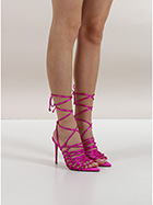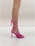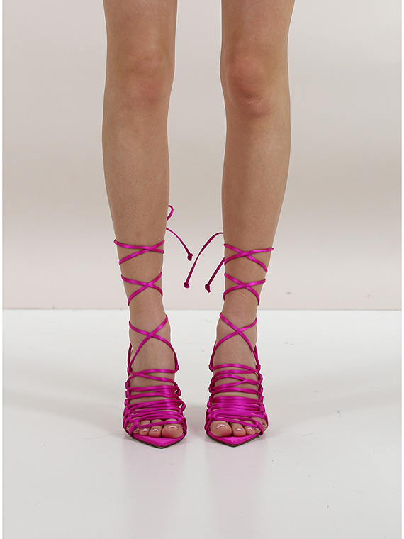 Sandal in saten fabric with ankle strap and leather and rubber sole. Heel height 110mm.