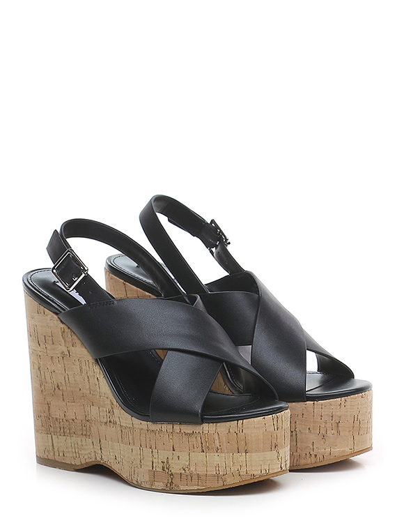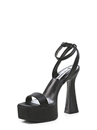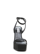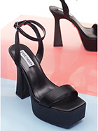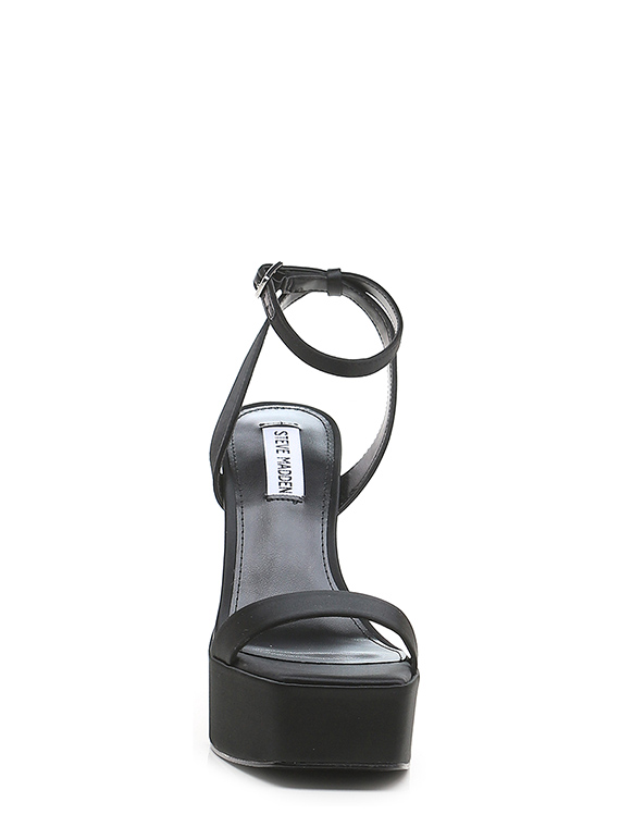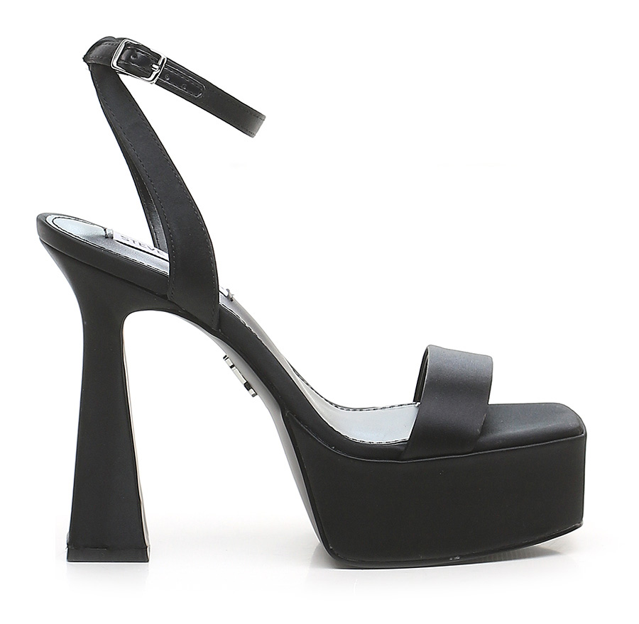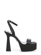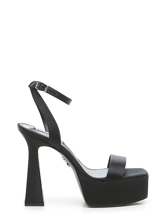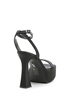 Satin sandal with ankle strap and rubber sole. Heel height 135mm, platform 50mm with 85mm ledge.