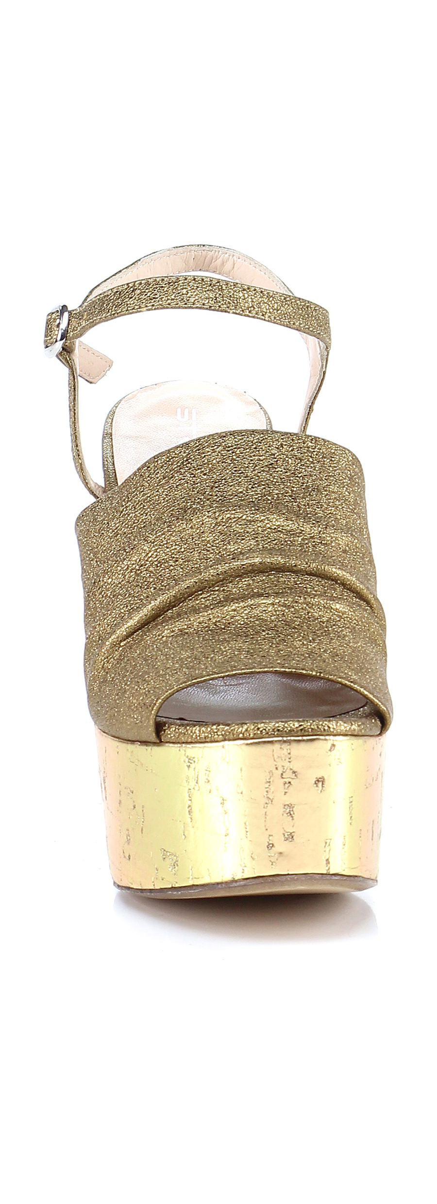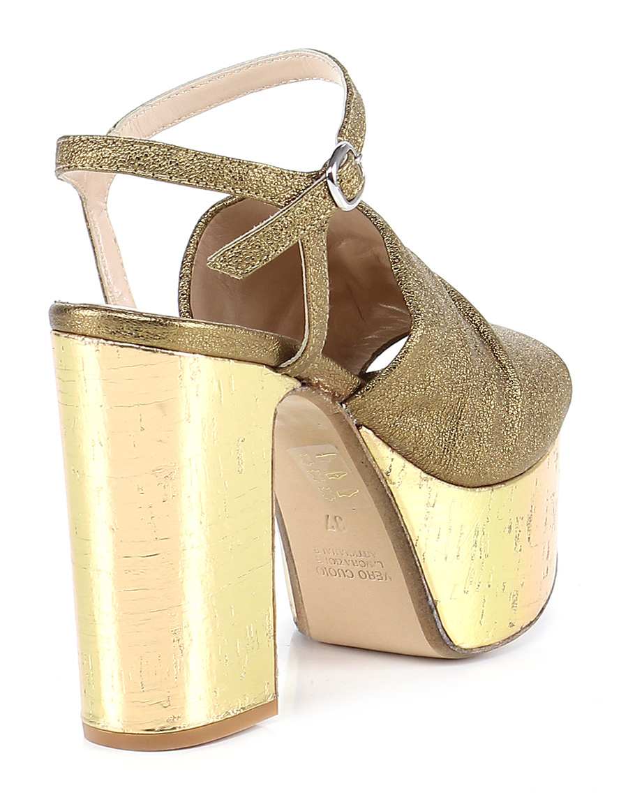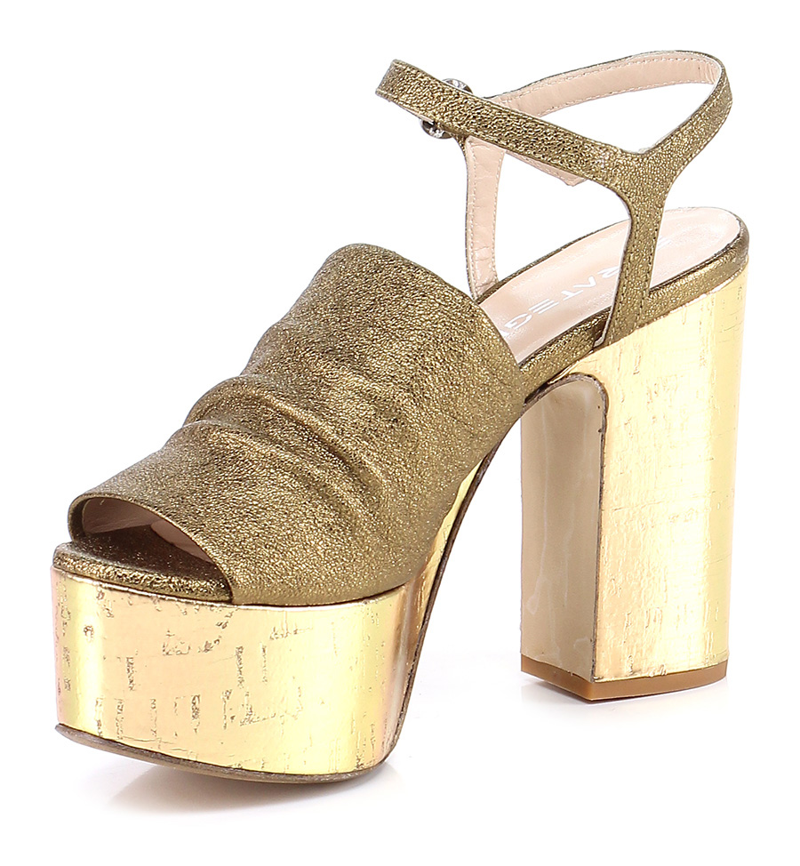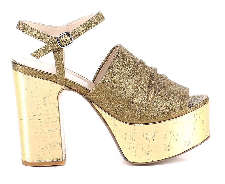 High sandal in laminated leather with ankle strap and leather sole. 125 heel, 45 platform with 75 ledge.