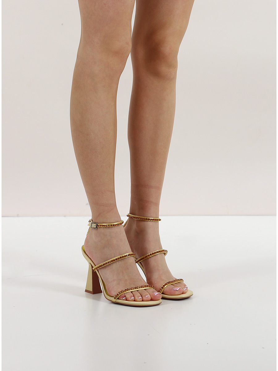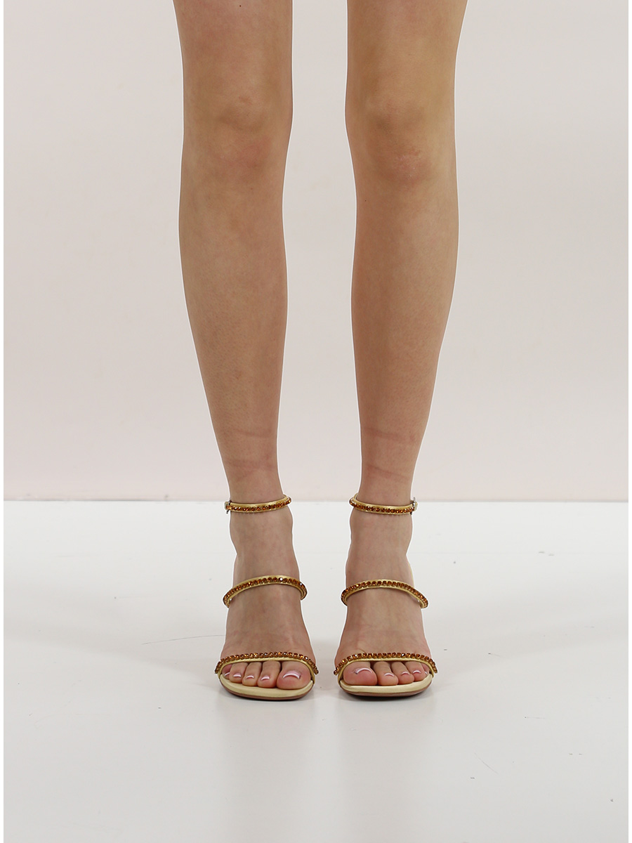 Fabric sandal with ankle strap and rhinestones on the upper. Rubber sole. Heel height 105mm.