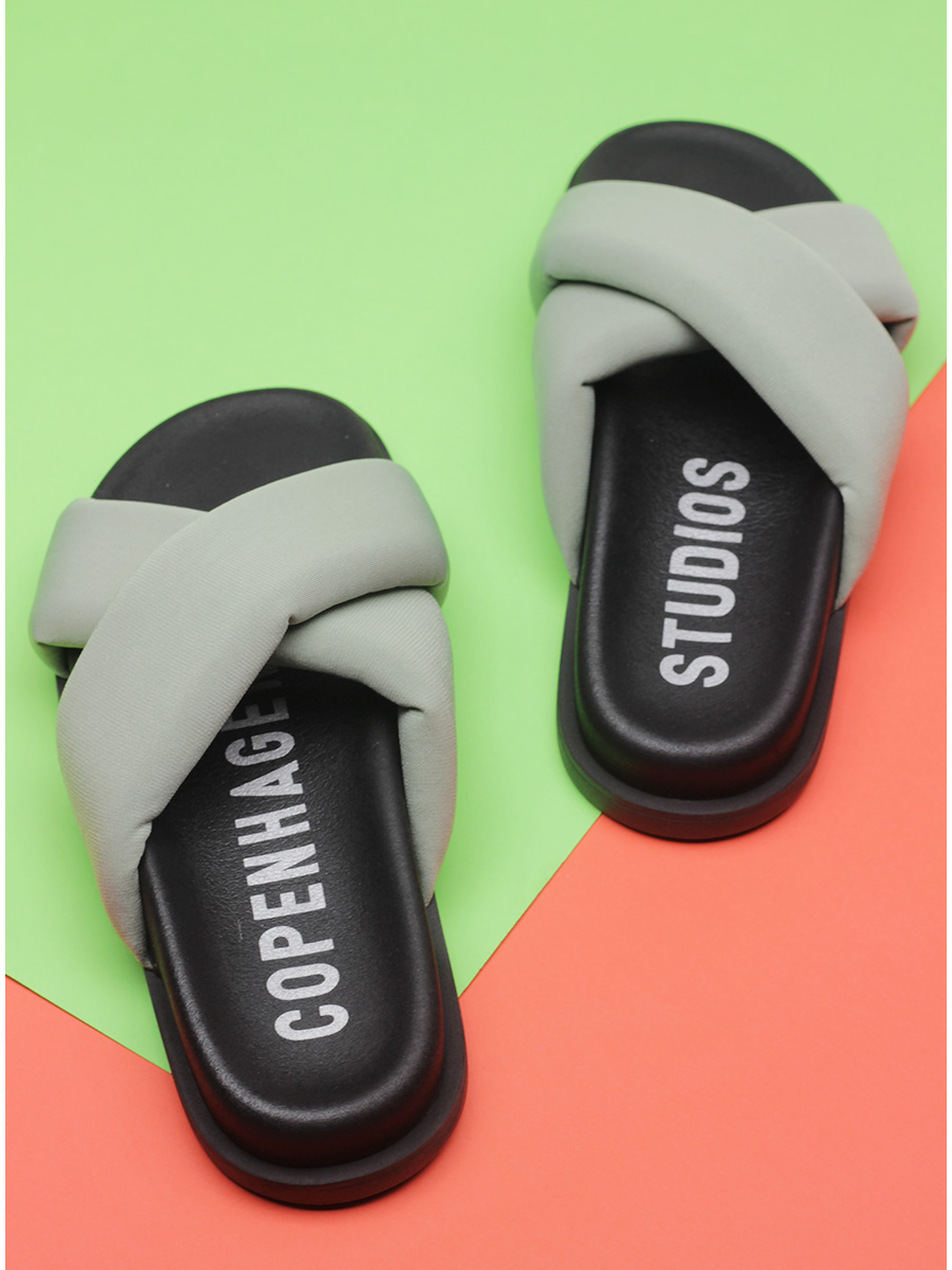 Sandalo in tessuto con suola in gomma. Altezza tacco 30mm, platform 25mm con battuta 5mm.