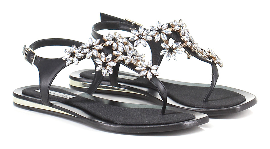 Sandalo basso in pelle con cinturino su retro e strass. Suola in gomma.