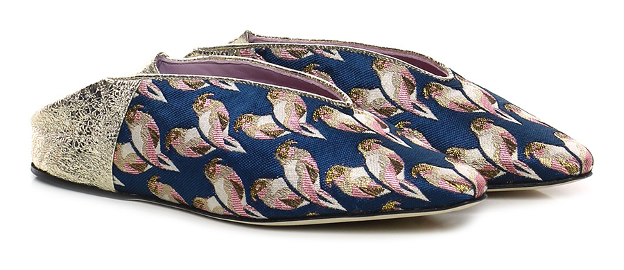 Scarpa bassa in tessuto stampato con pelle laminato effetto crack. Suola in cuoio. Tacco 20, zeppa interna.