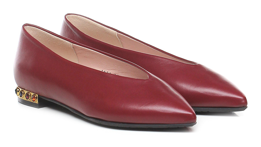 Scarpa bassa in pelle con suola in gomma. Tacco 15, rivestito con applicazioni in strass.