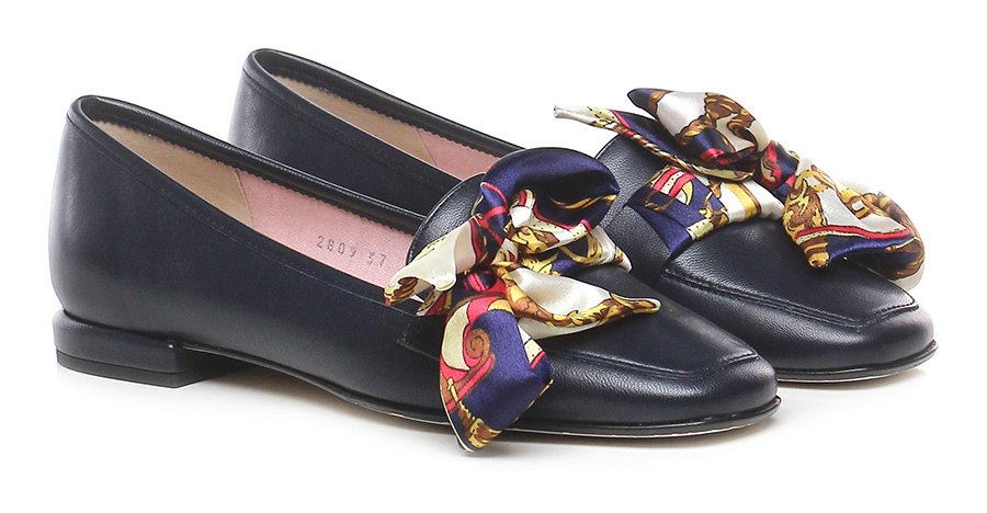 Scarpa basso in pelle con fiocco in tessuto in seta stampato, suola in cuoio. Tacco 15, rivestito in camoscio.