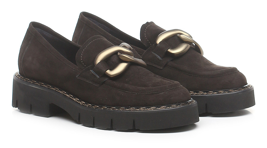 Suede shoe with front chain accessory and rubber sole. 40mm heel height, 25mm platform with 15mm ledge.