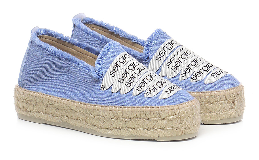 Scarpa bassa in tessuto denim a taglio vivo, suola in gomma. Tacco 40, platform 40. Zeppa rivestita in corda, logo lettering frontale.