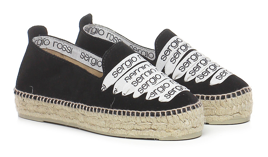 Scarpa bassa in camoscio, suola in gomma. Tacco 40, platform 40. Zeppa rivestita in corda, logo lettering frontale